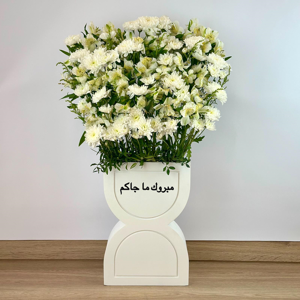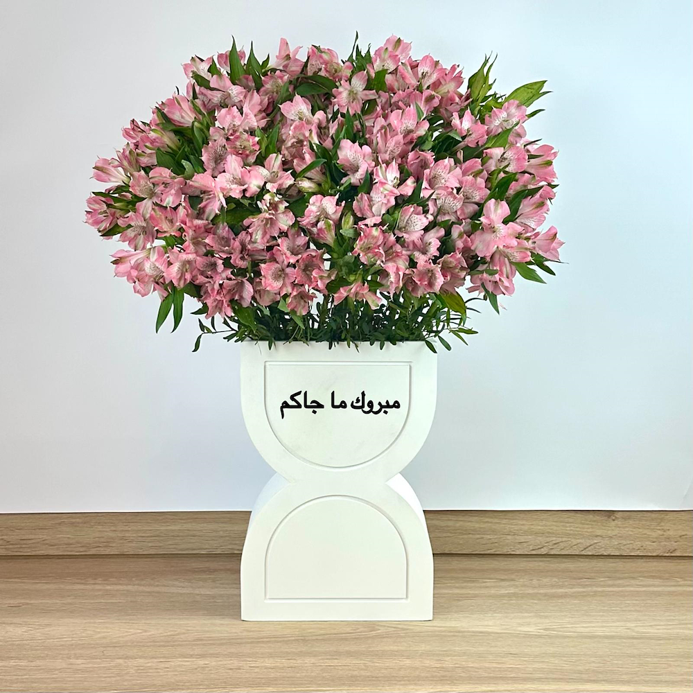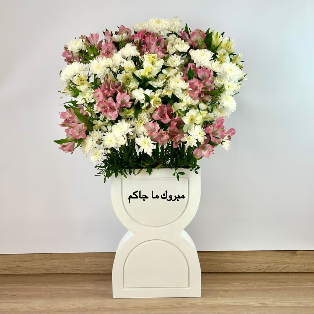 This bouquet contains alstroemeria and chrysanthemum flowers with chocolates.