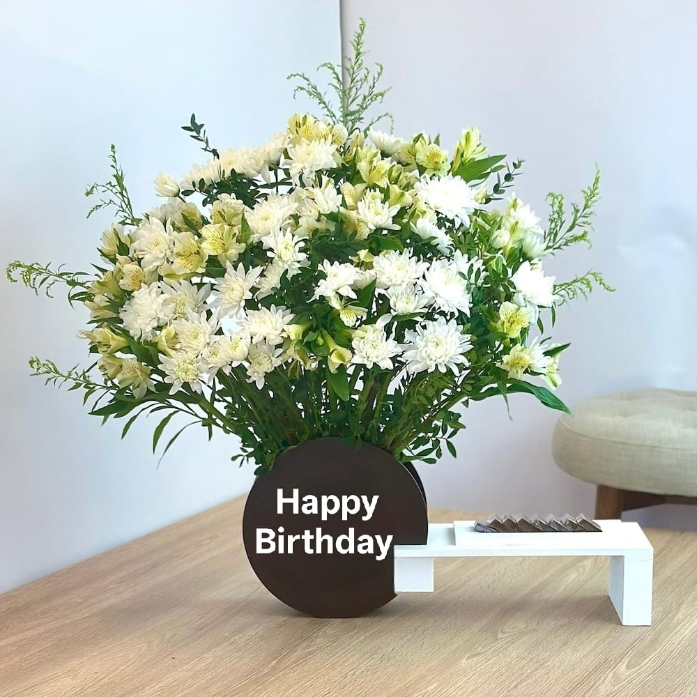 This bouquet contains alstroemeria and chrysanthemum flowers with chocolates.