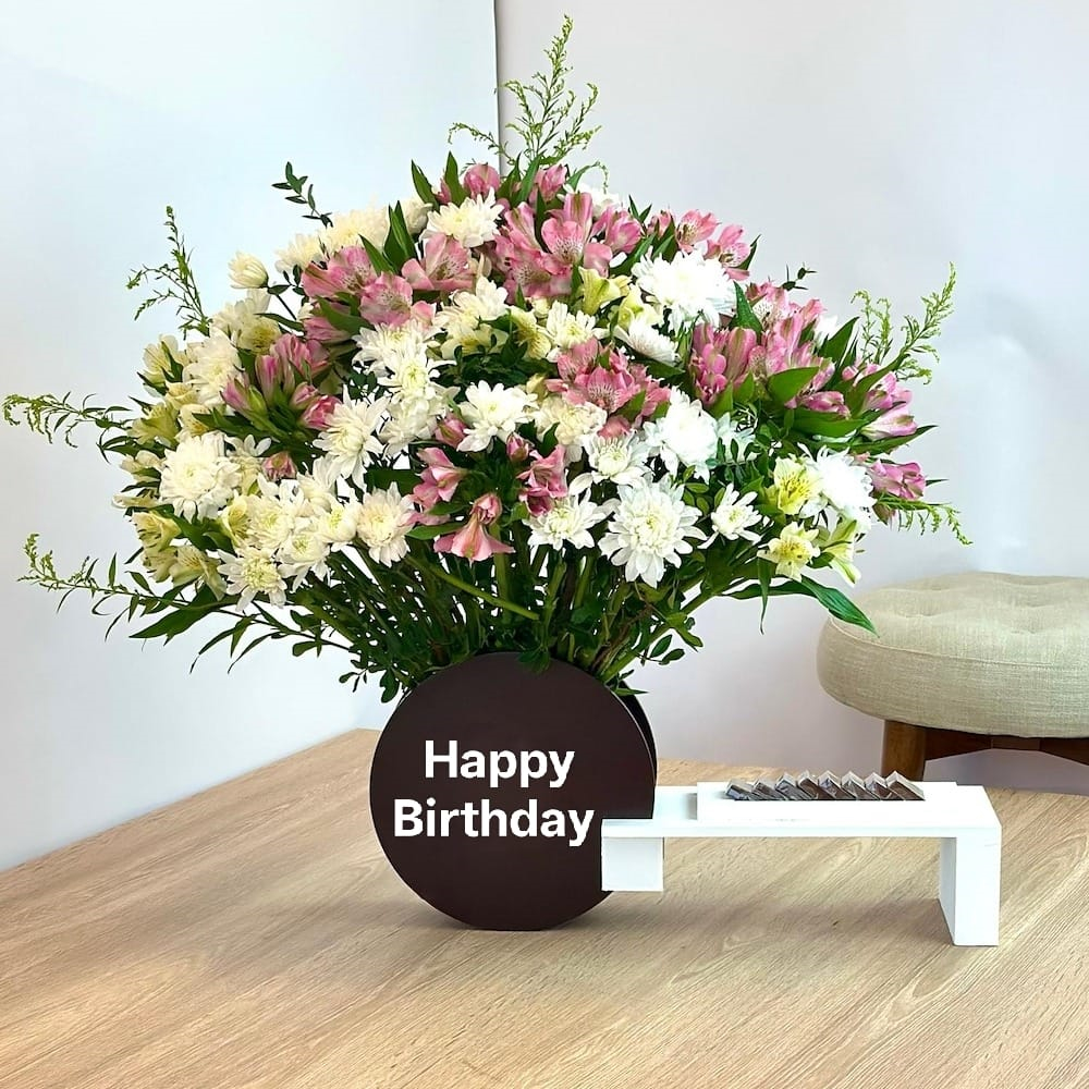 This bouquet contains alstroemeria and chrysanthemum flowers with chocolates.