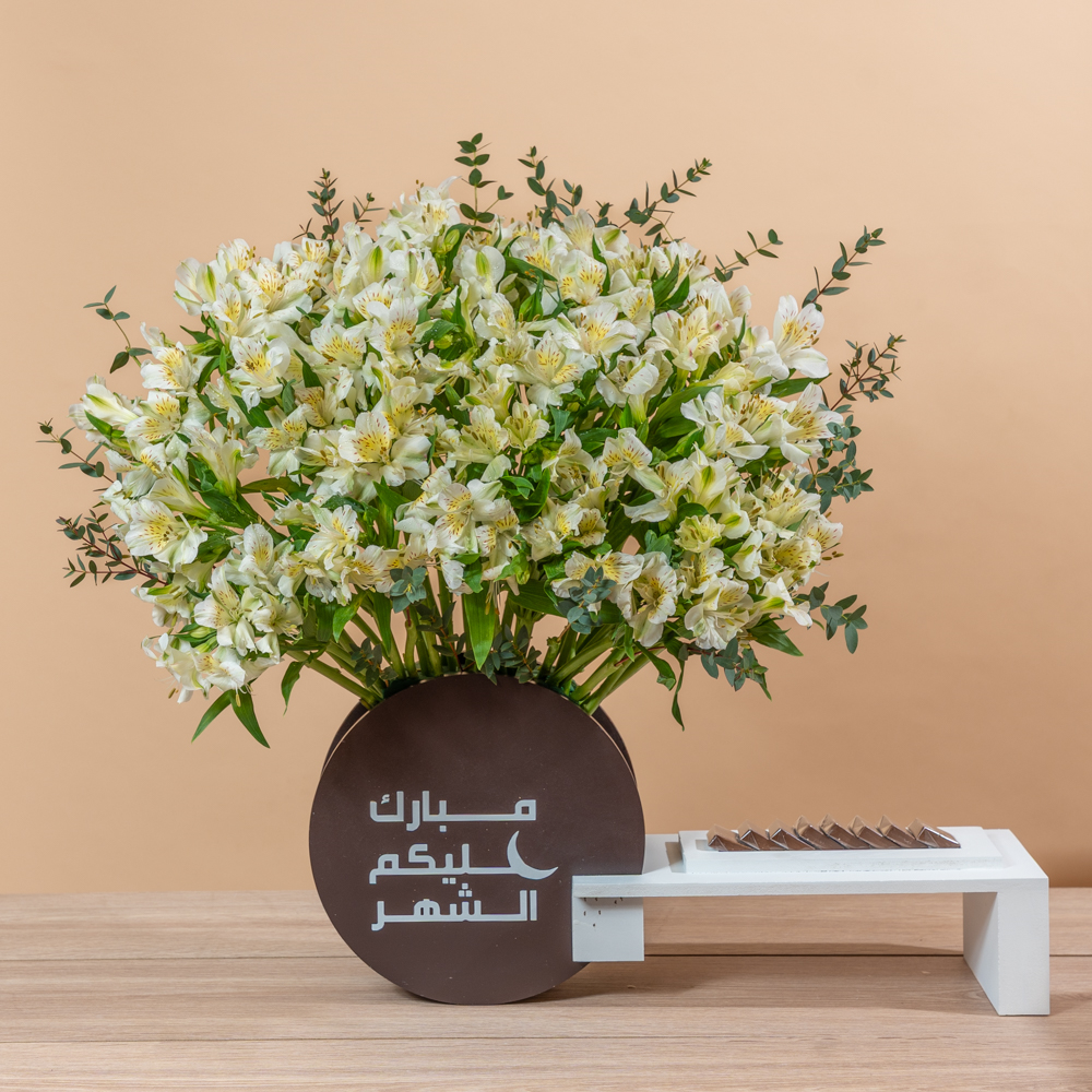 This bouquet contains alstroemeria with chocolates.