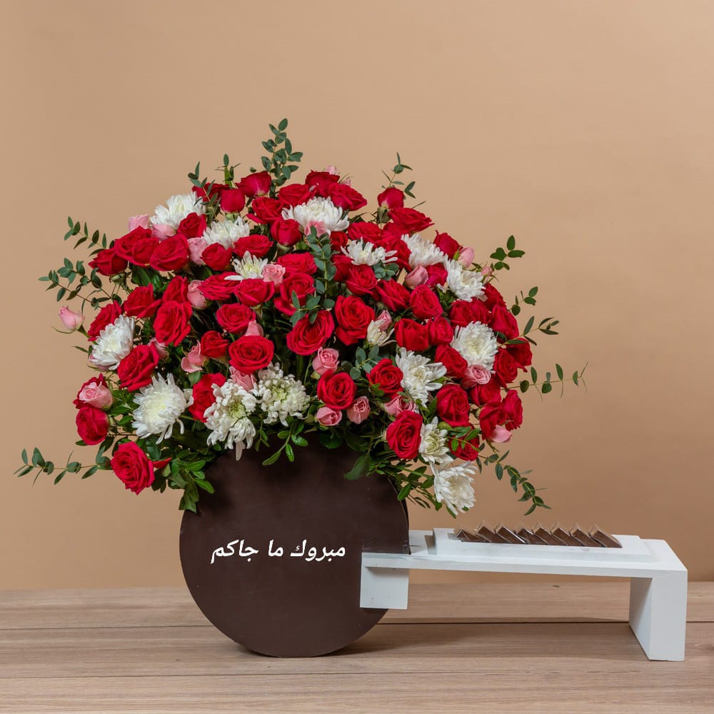 This bouquet contains roses and chrysanthemum flowers with chocolates.
