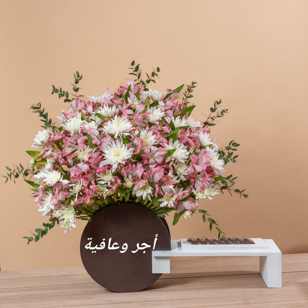 This bouquet contains alstroemeria and chrysanthemum flowers with chocolates.