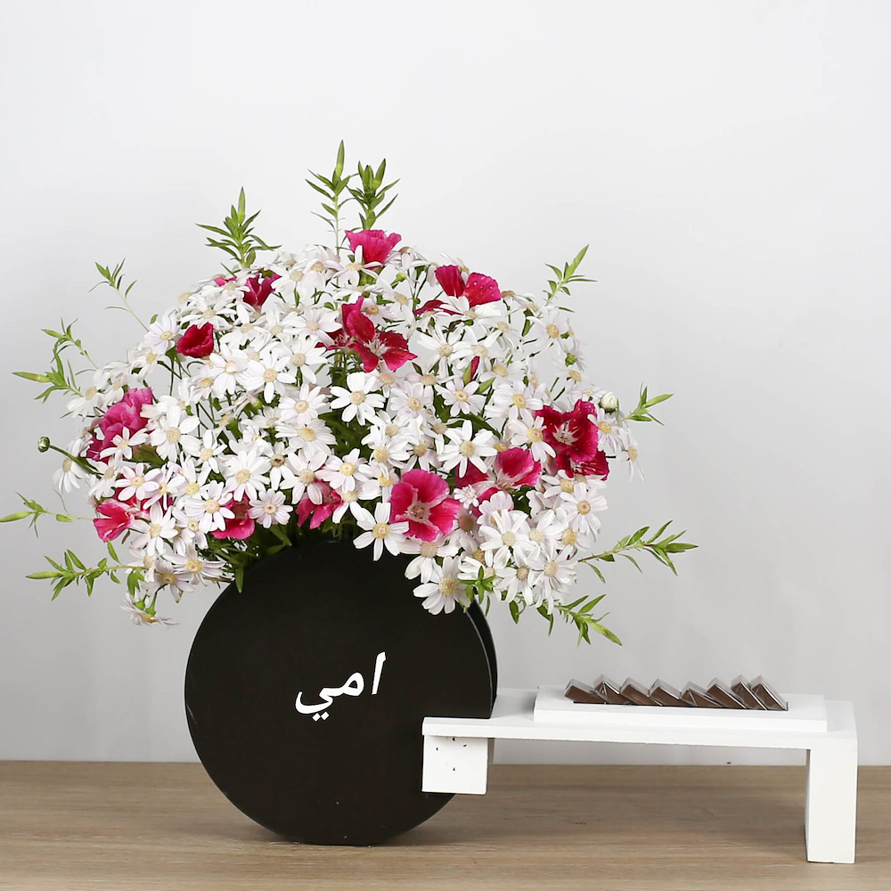 A bouquet featuring beautiful chrysanthemum and satin flowers with chocolates.