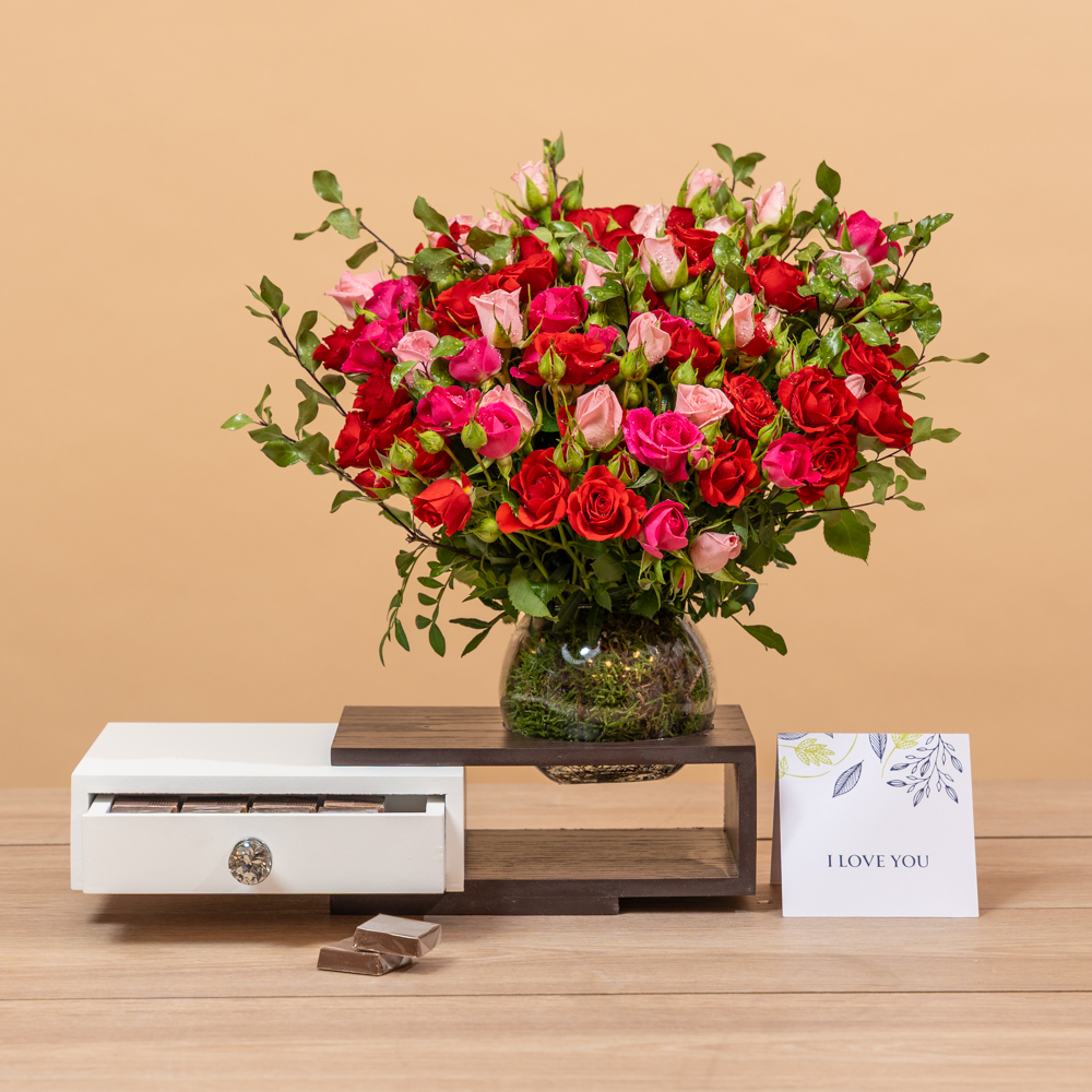 This bouquet contains red and pink roses, paired with delicious chocolates. A perfect gift to delight someone special.