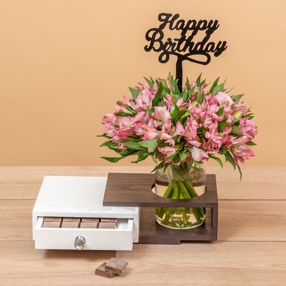 This bouquet contains pink alstroemerias, paired with delicious chocolates. A perfect gift to delight someone special.