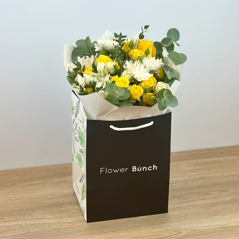 A hand bouquet containing baby roses, chrysanthemums, alstroemerias, and green leaves, arranged beautifully.