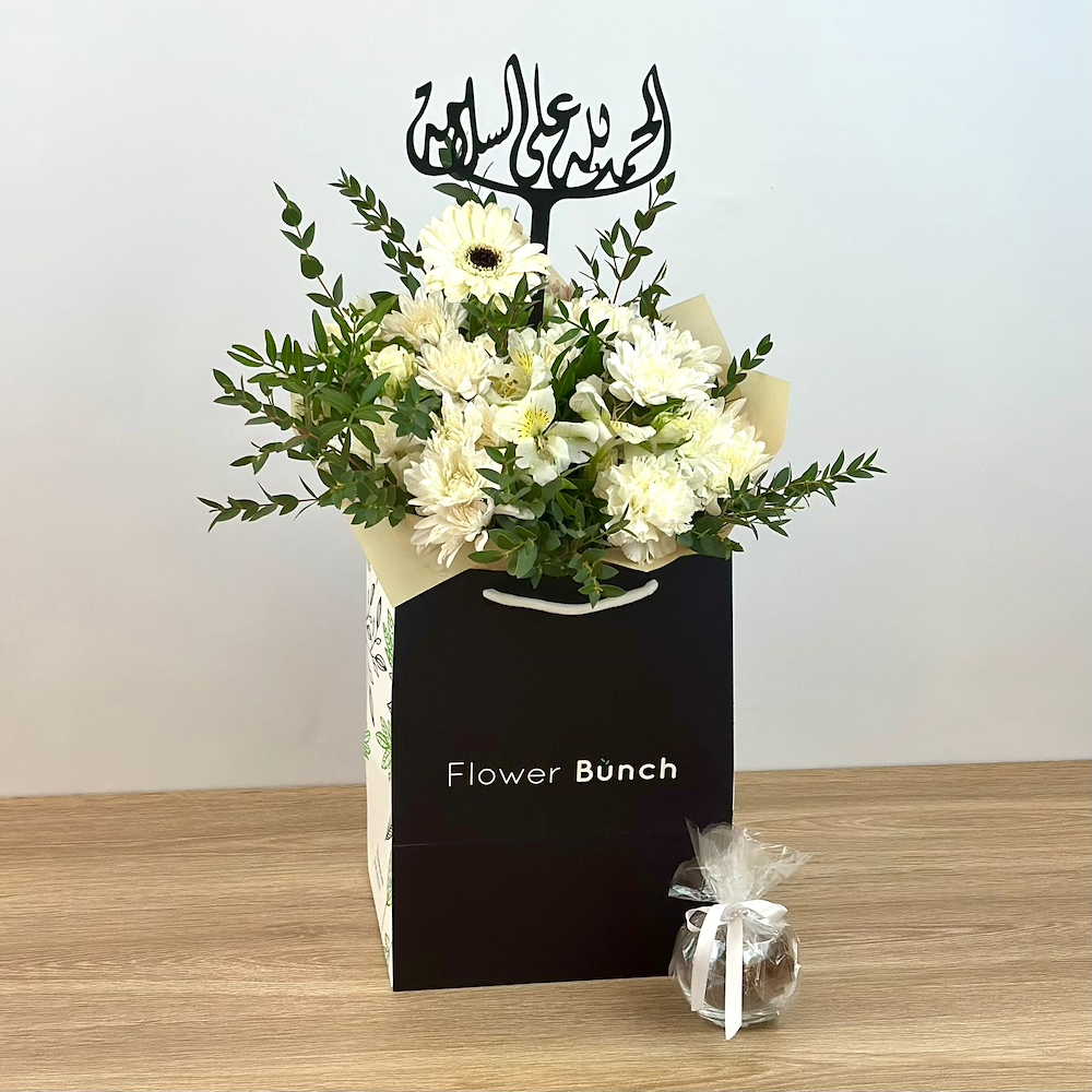 A hand bouquet containing roses, cherries, and carnations with greenery and chocolates.