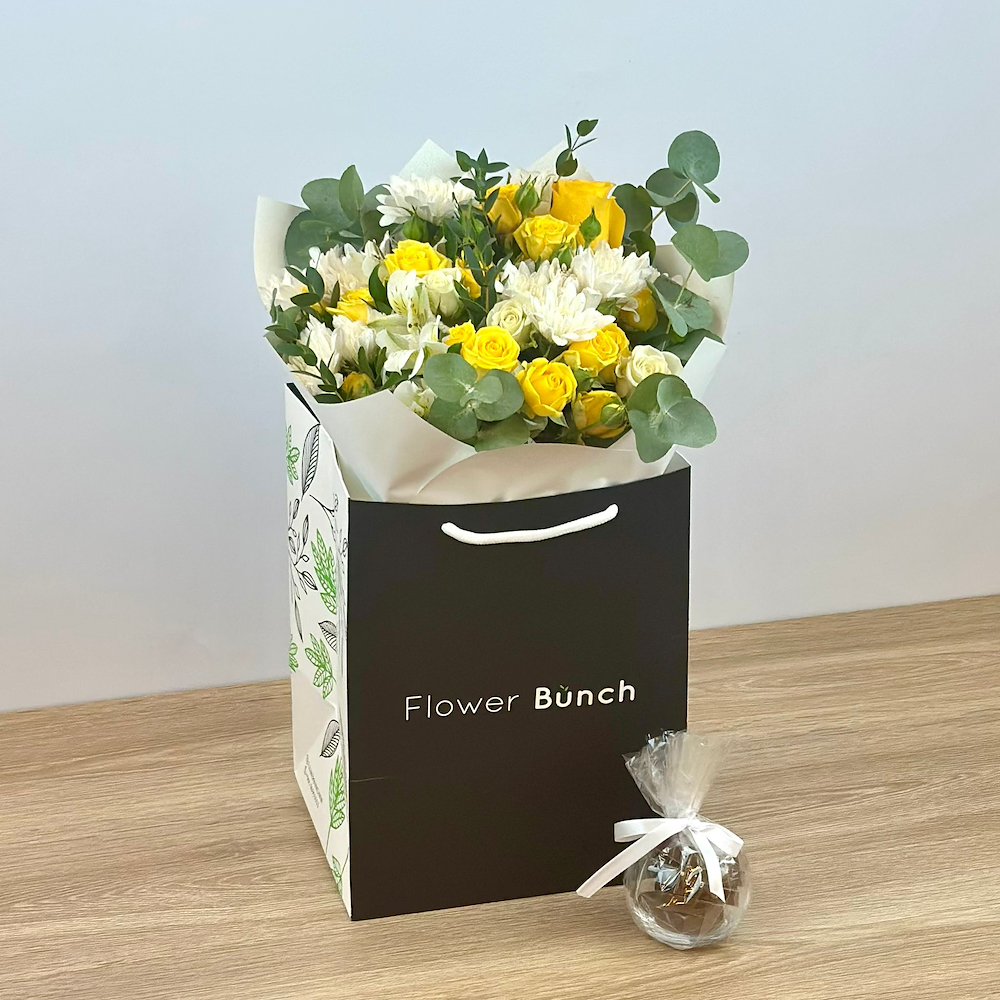 Hand bouquet containing baby roses and cherries with greenery and chocolates.