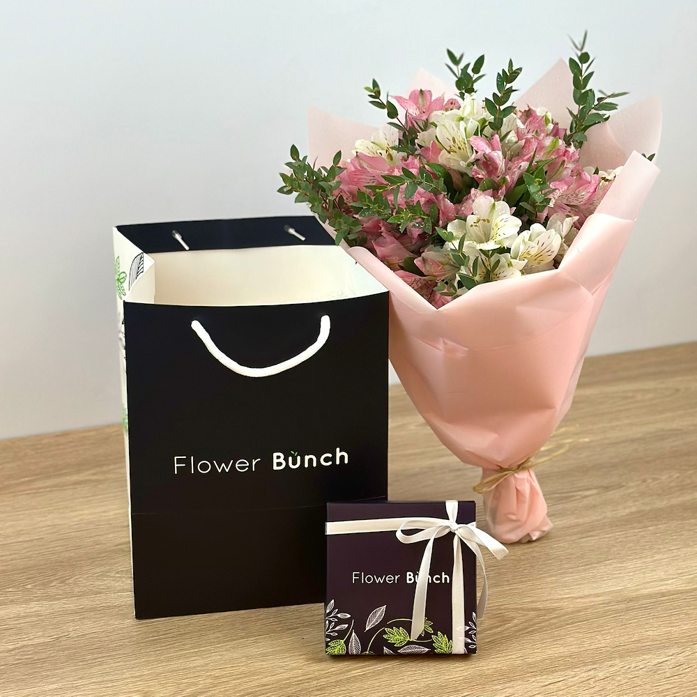 A hand bouquet filled with alstroemeria flowers and green leaves with chocolates.