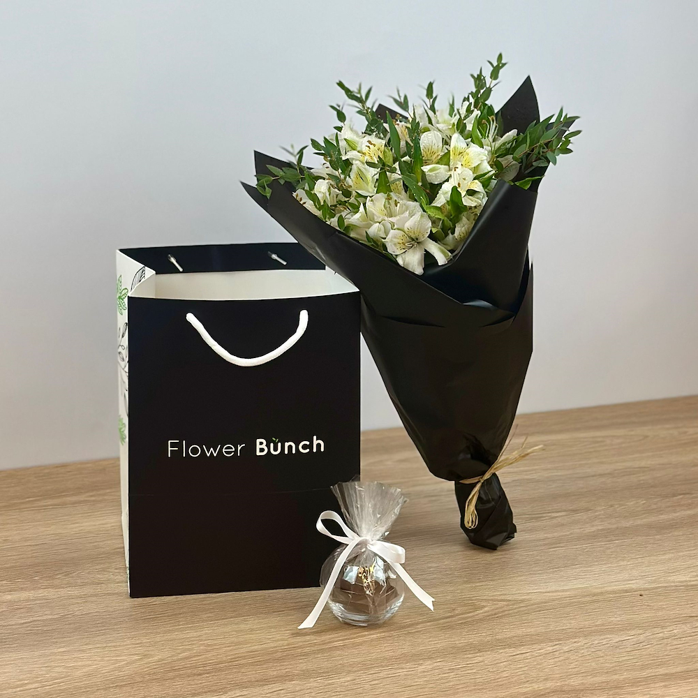 A hand bouquet filled with alstroemeria flowers and green leaves with chocolates.