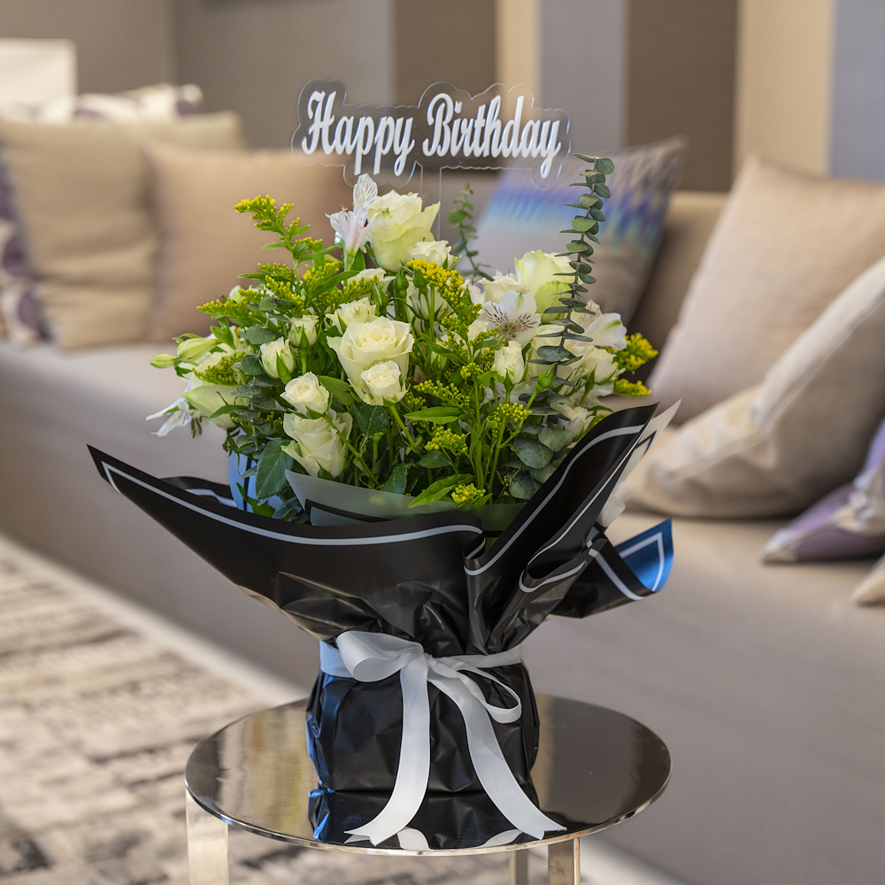 A hand bouquet filled with roses and baby roses with a special wrapping.