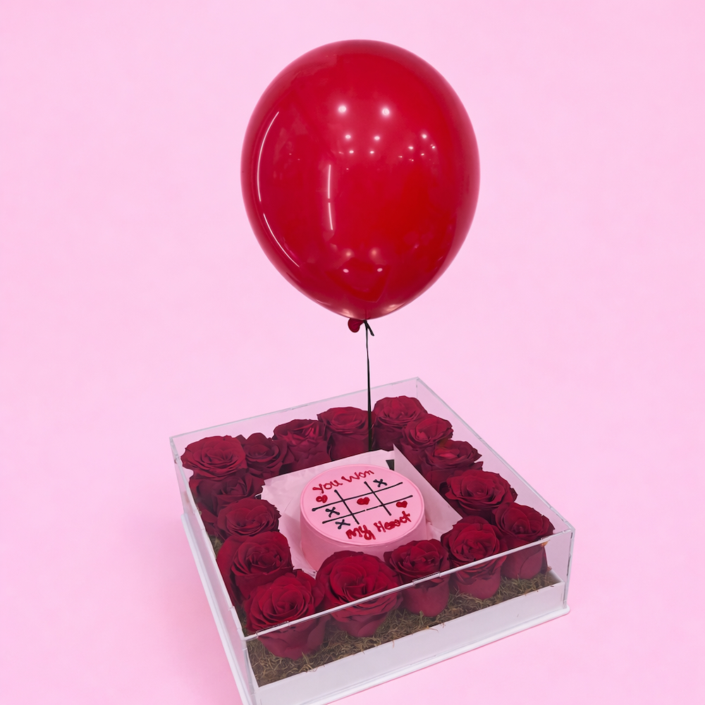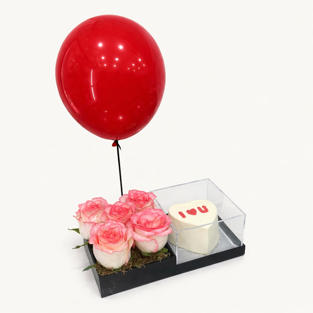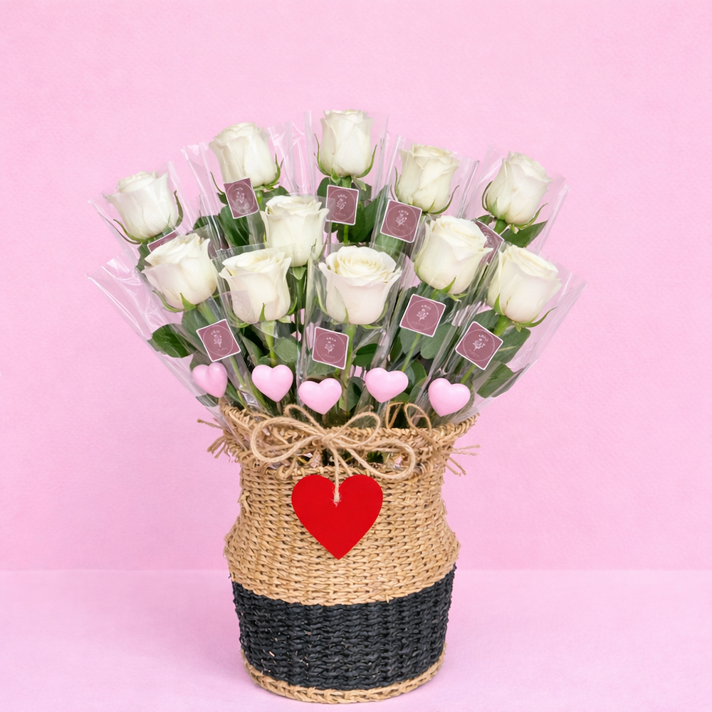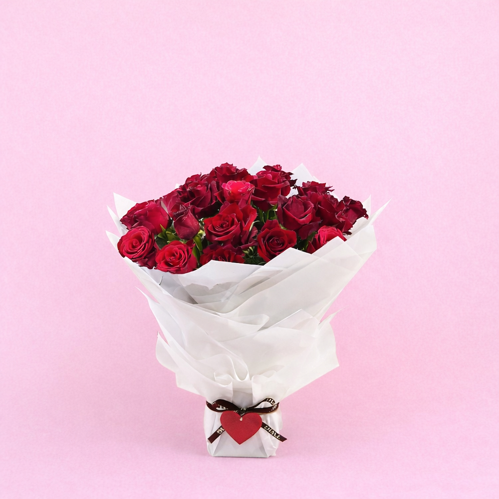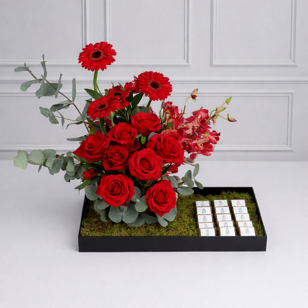 A bouquet that contains roses, gerberas, orchids and eucalyptus leaves along with chocolates.