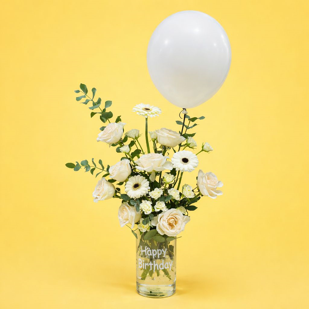 A bouquet containing roses, baby roses, and gerberas, arranged beautifully in a vase with a helium balloon.
