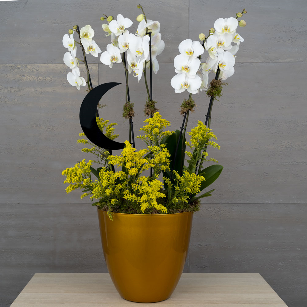 This bouquet contains orchids and carnations.