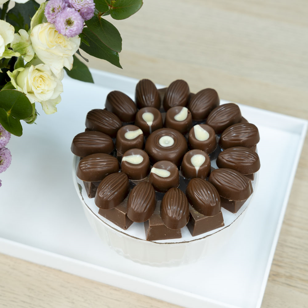 This bouquet contains roses and chrysanthemums with a chocolate plate.