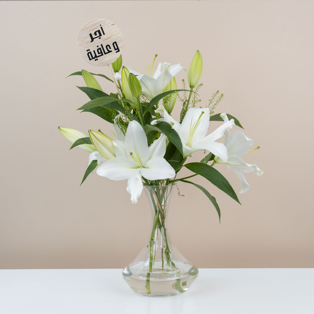 A vase that contains casablanca lilies.