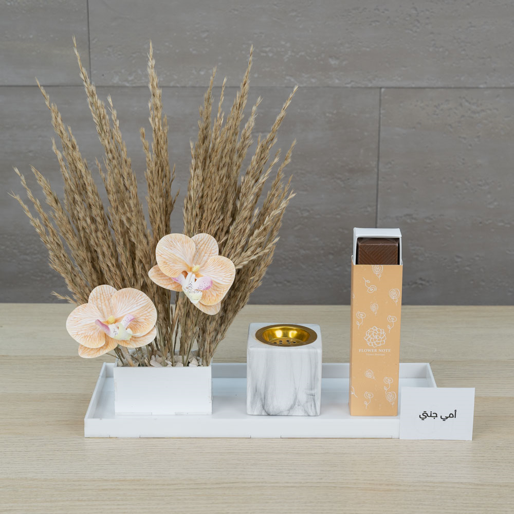 An acrylic tray containing preserved and artificial flowers, along with an incense burner and a small luxury chocolate box.