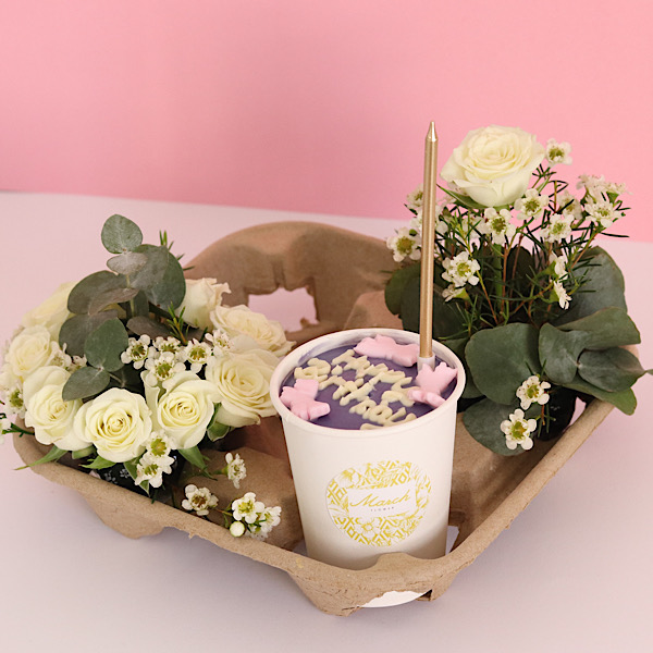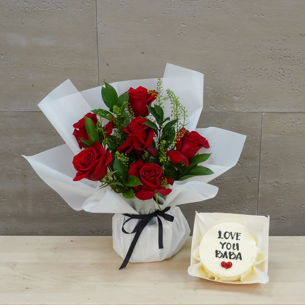 This bouquet contains roses with a chocolate cake.