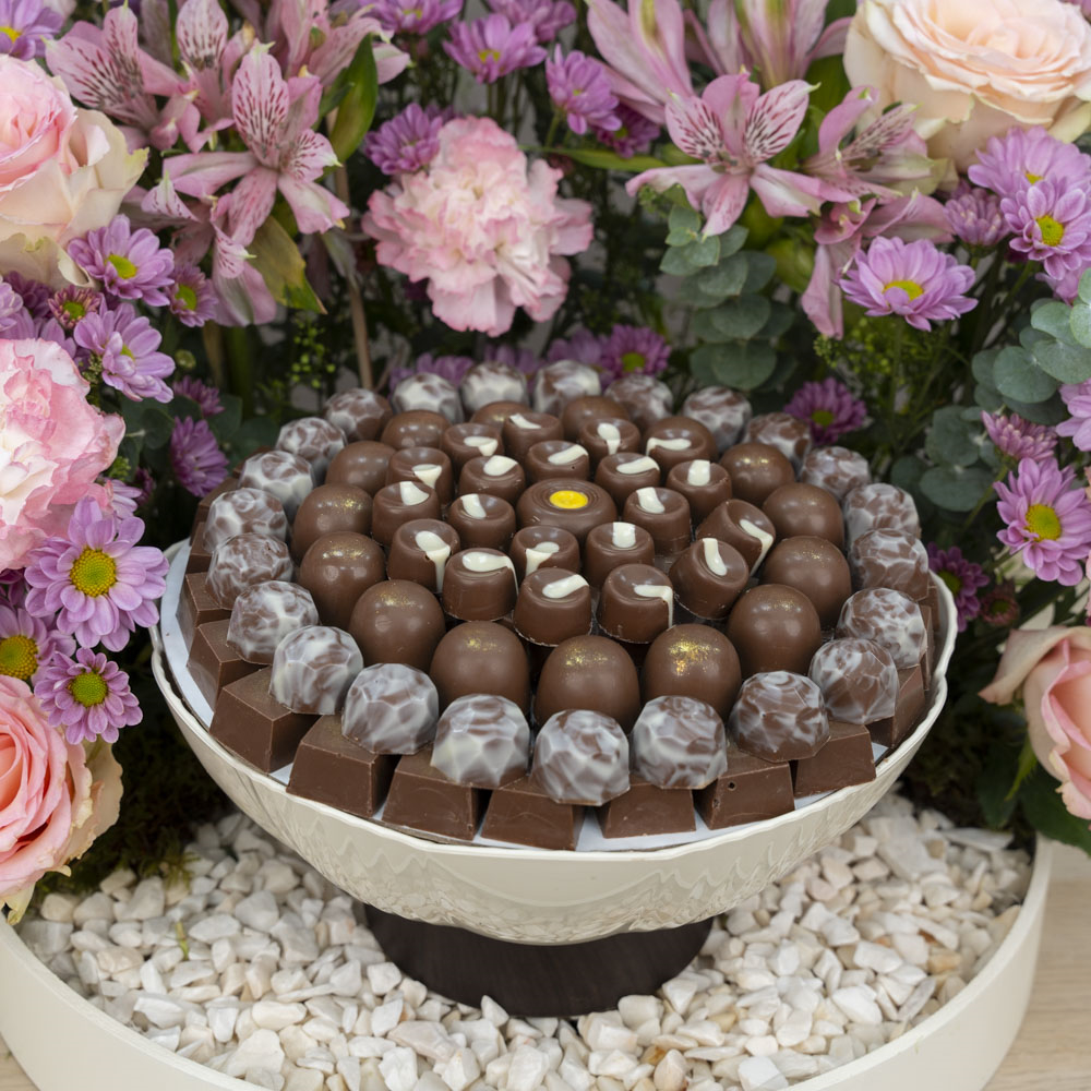 A tray that contains roses, carnations, alstroemerias, daisies and eucalyptus along with chocolates.
