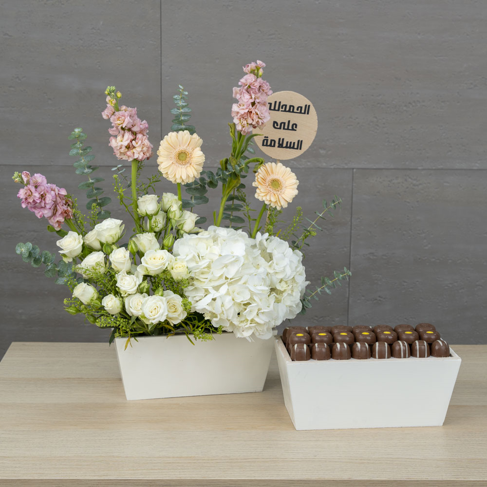 This bouquet contains gerberas, hydrangeas, matthiola, and baby roses with chocolates.