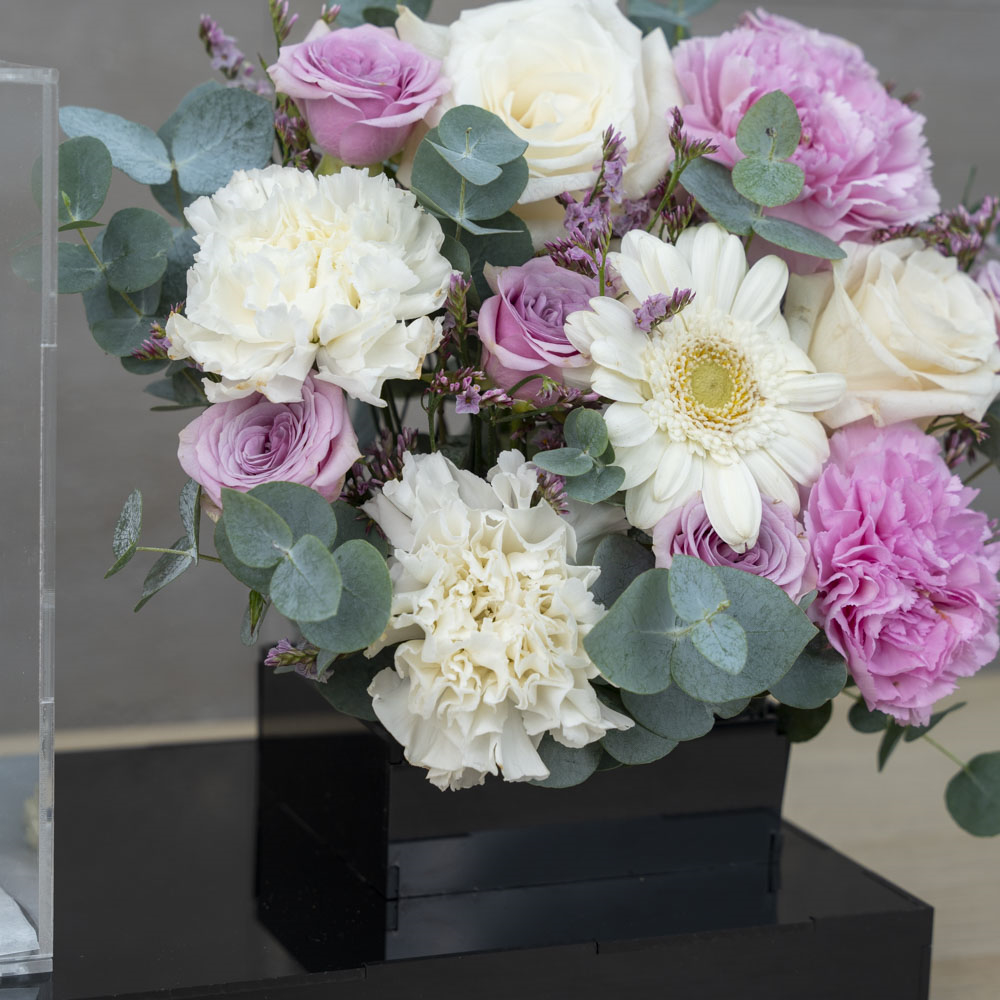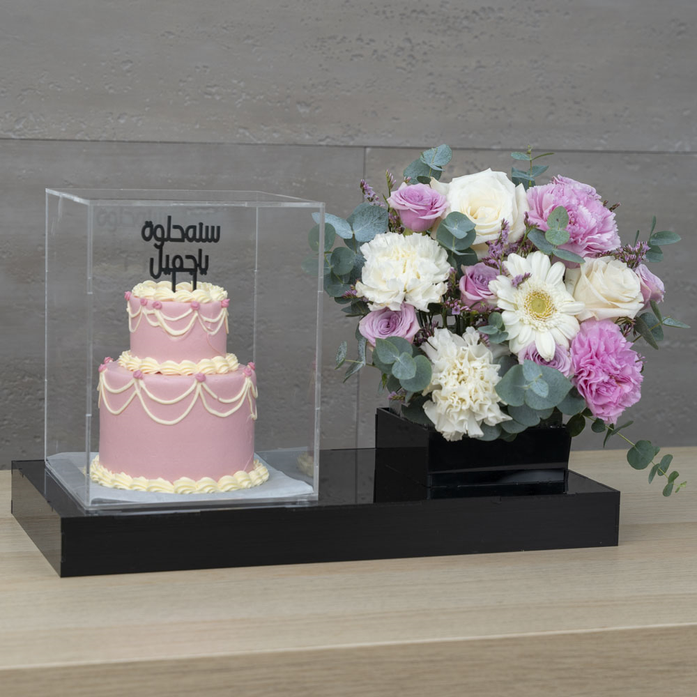 This bouquet contains roses, baby roses, gerberas, and carnations with a chocolate cake.