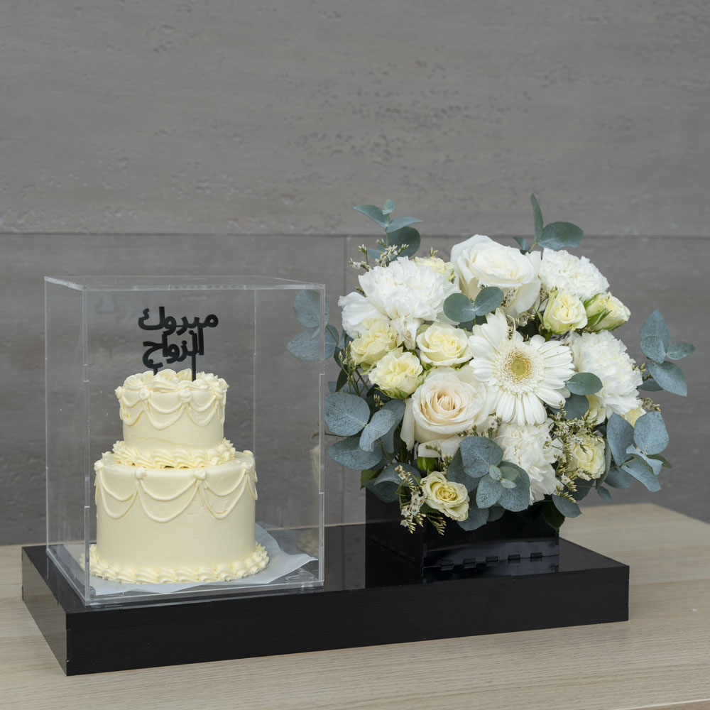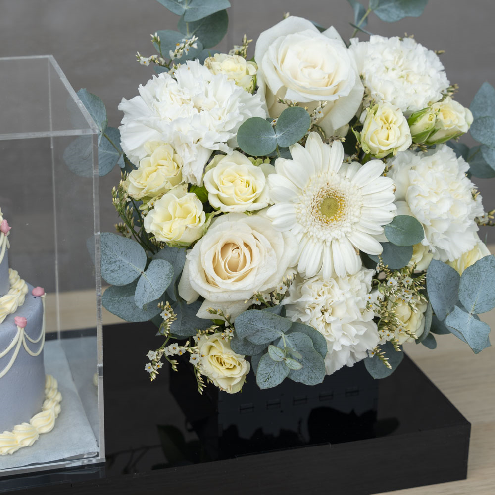 This bouquet contains roses, baby roses, gerberas, and carnations with a chocolate cake.