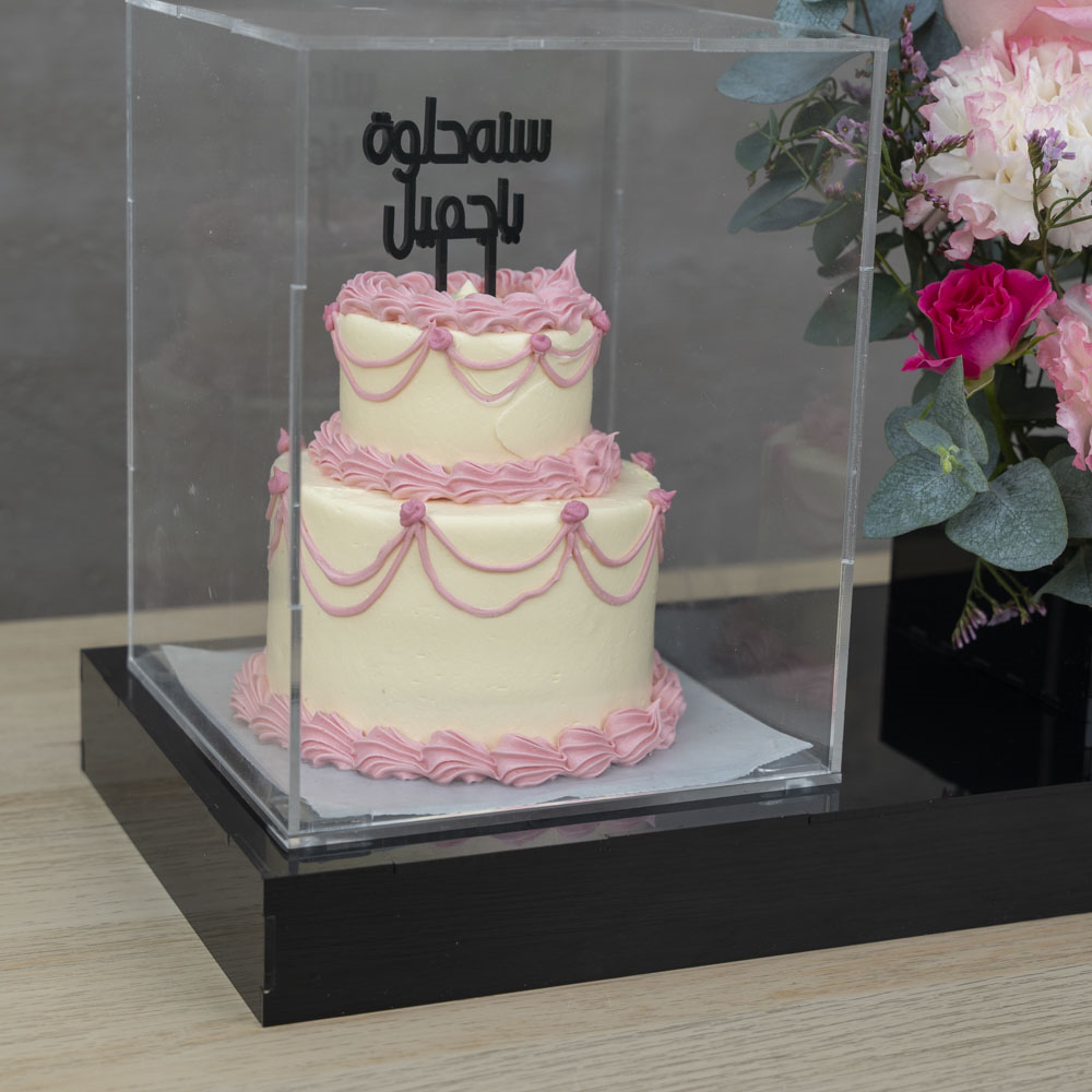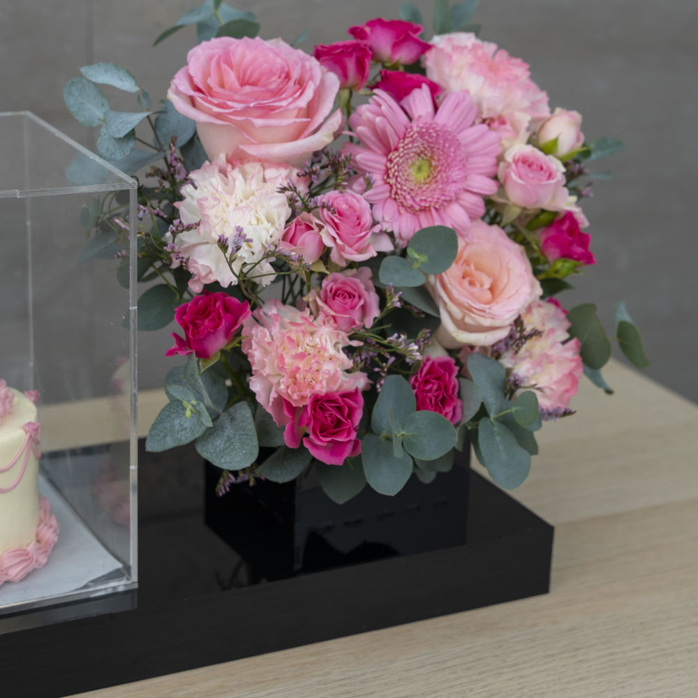 This bouquet contains roses, baby roses, gerberas, and carnations with a chocolate cake.