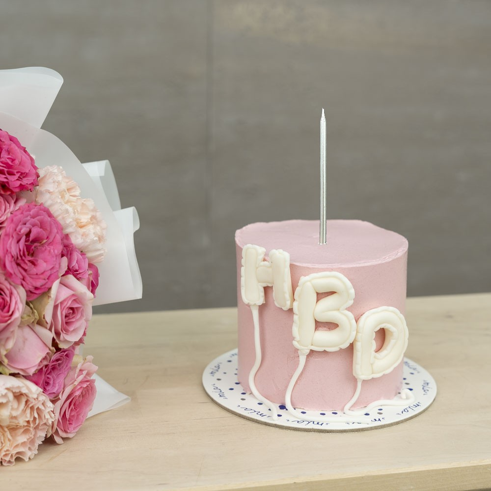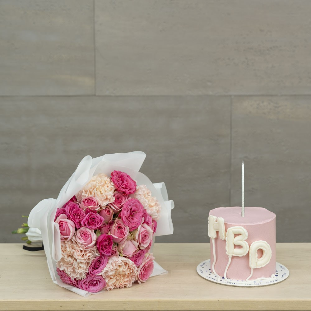 This bouquet contains baby roses and carnations with a chocolate cake.