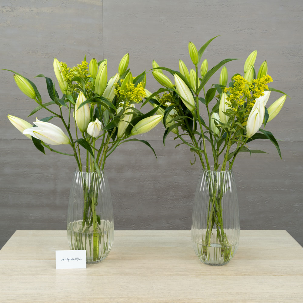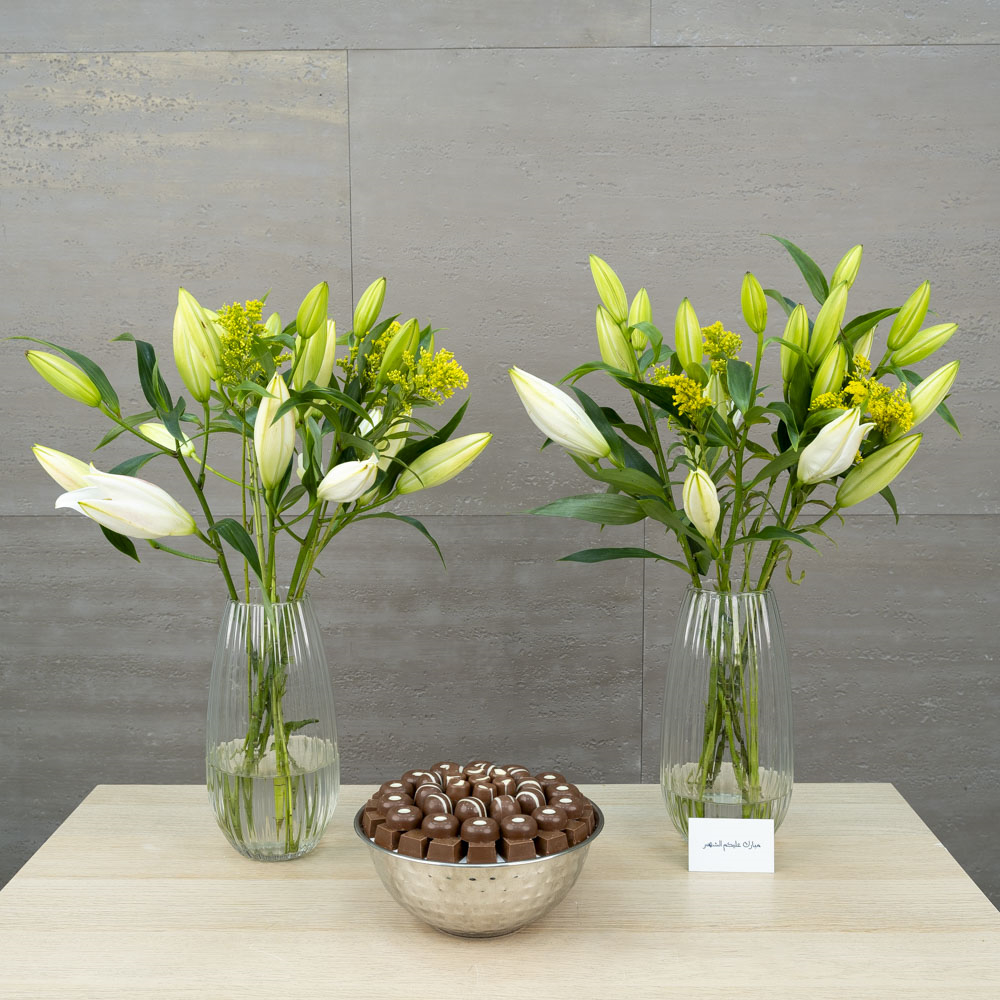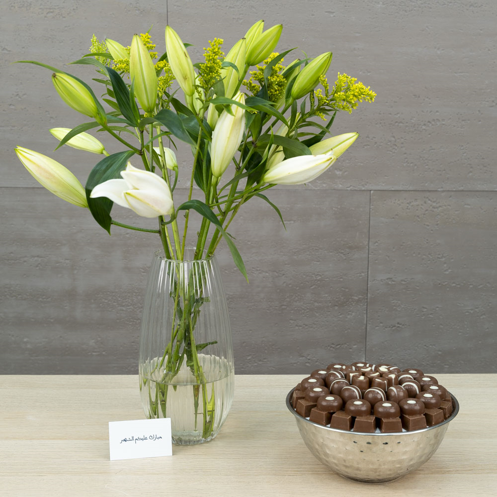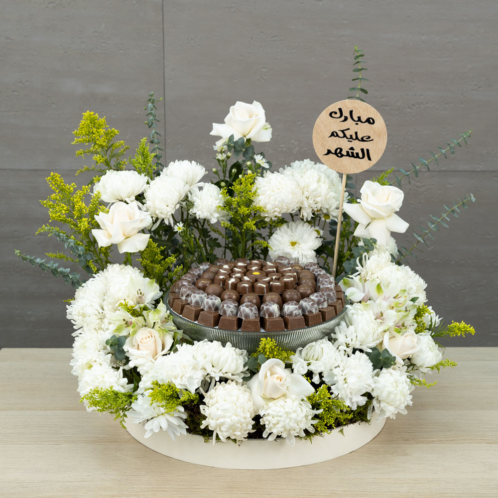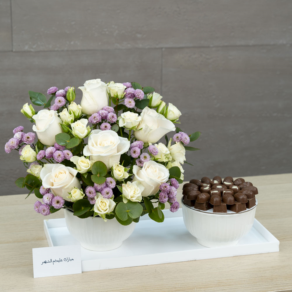 This bouquet contains orchid plants with baby rose and alstroemeria flowers.