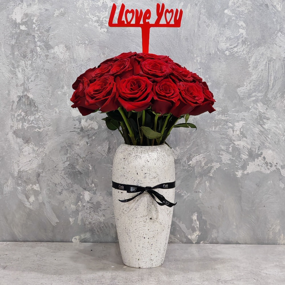 A bouquet containing roses, baby roses, and wax flowers, arranged beautifully in a vase.