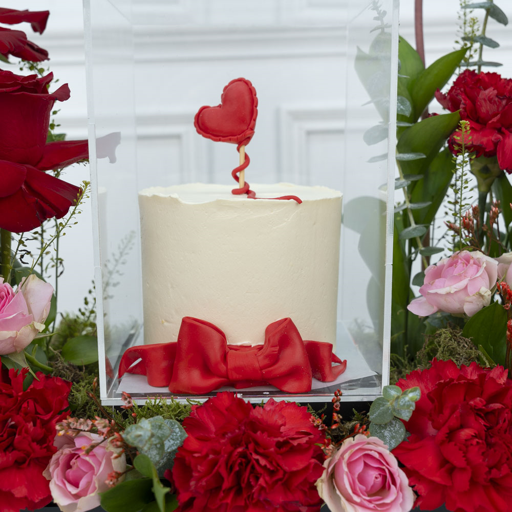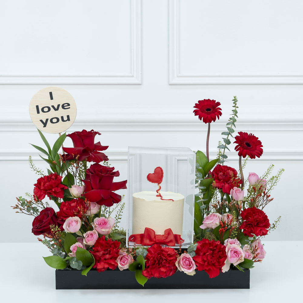 This bouquet contains roses, gerberas, and carnations with a chocolate cake.