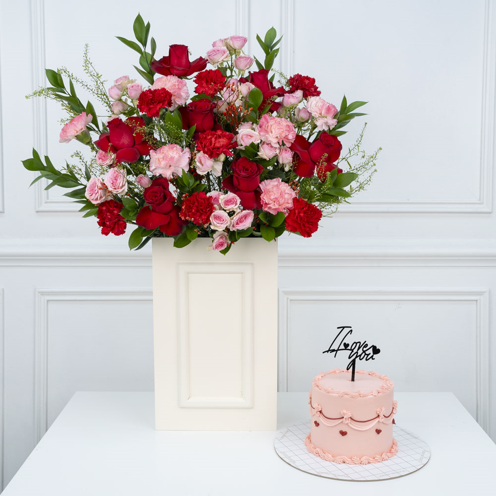 This bouquet contains roses, baby roses, and carnations with a chocolate cake.