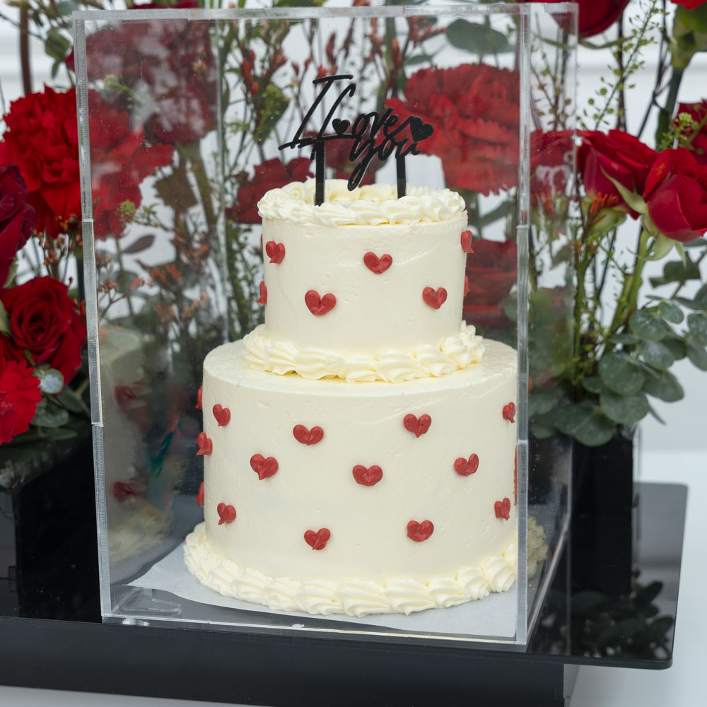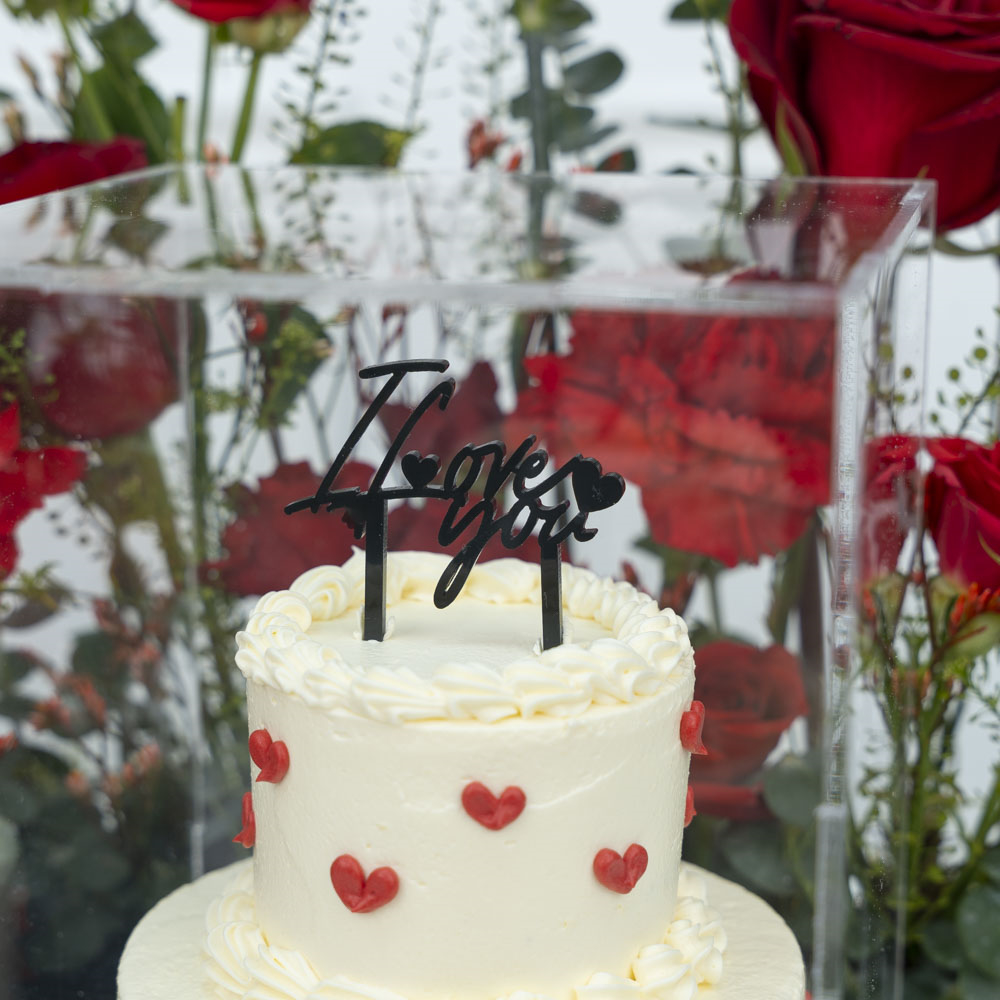 This bouquet contains roses, gerberas, and carnations with a chocolate cake.