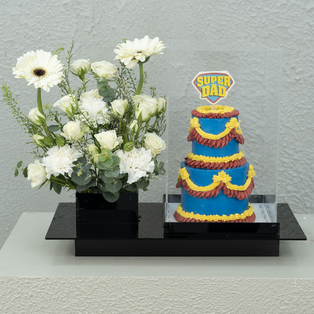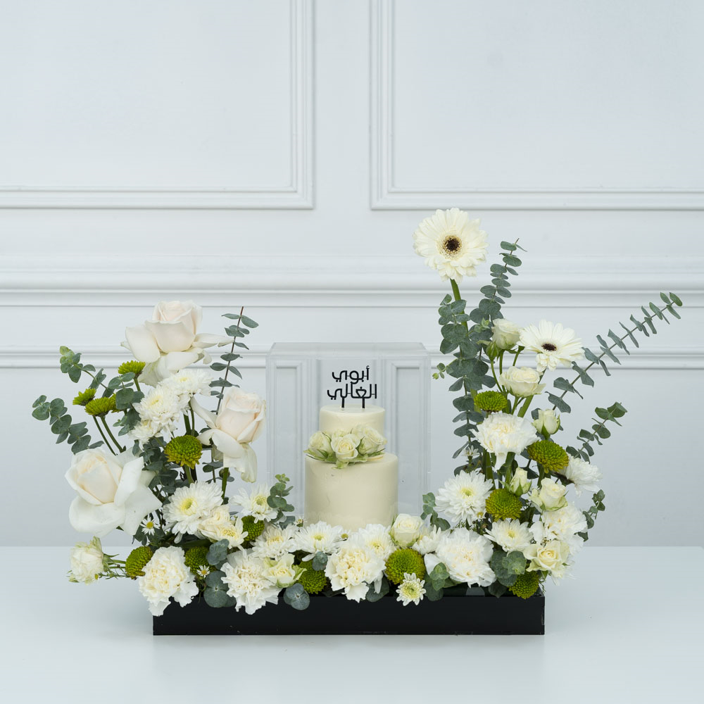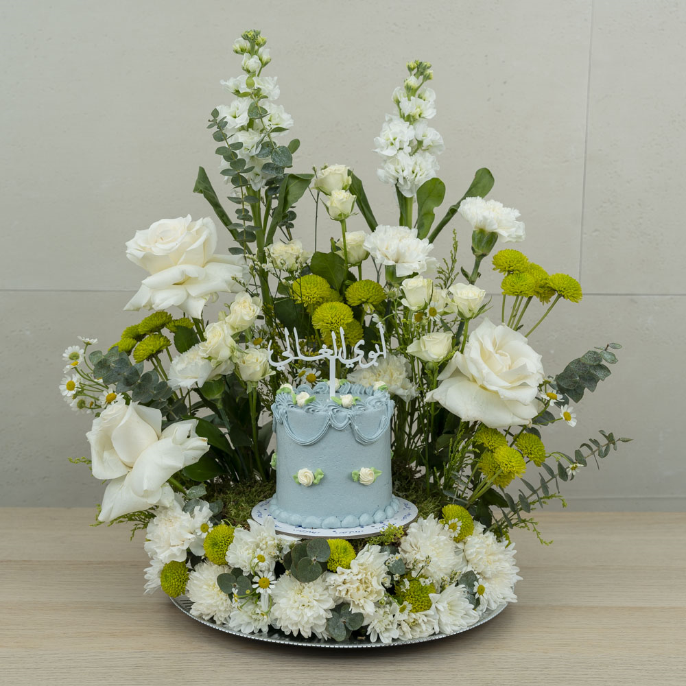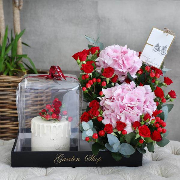 This bouquet contains roses, gerbera and Chrysanthemums with a chocolate cake.