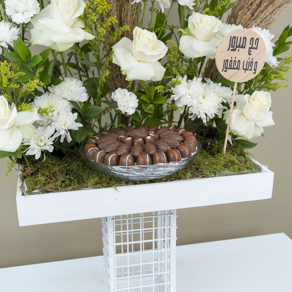 A stand that contains roses, matthiolas chrysanthemums and carnations along with chocolates and a Hajj topper.