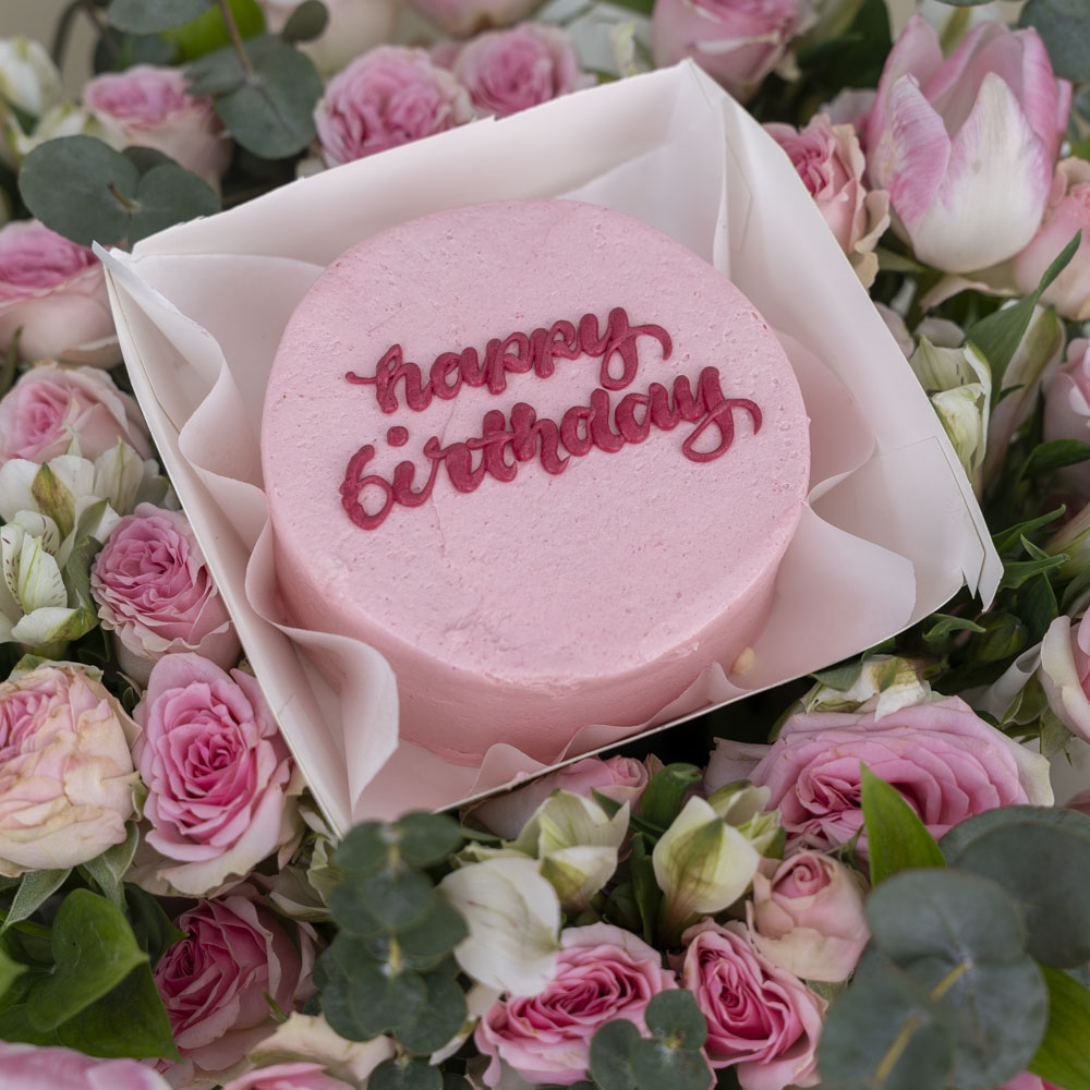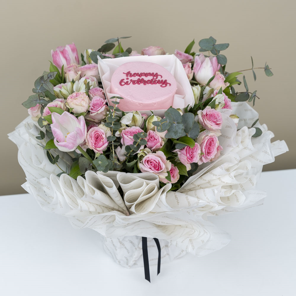 This bouquet contains baby roses, tulips, and alstroemerias with a chocolate cake.