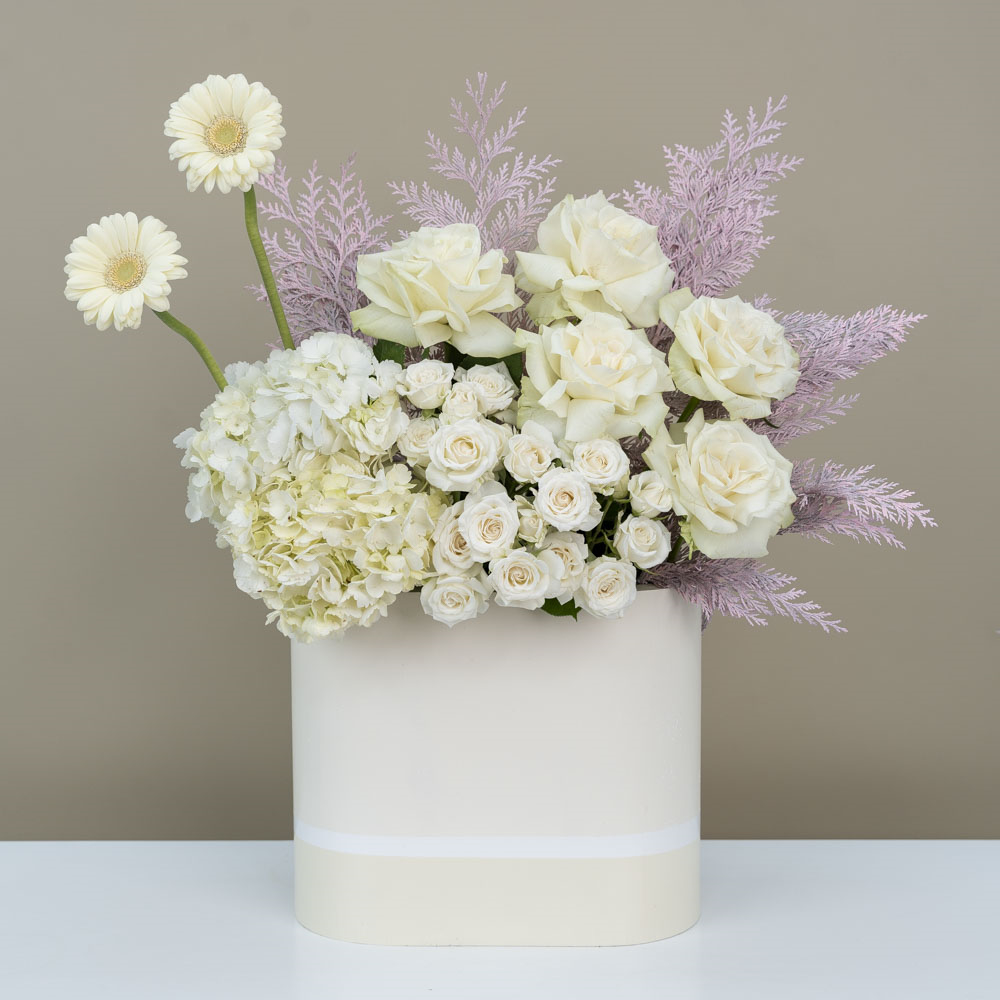 This bouquet contains gerberas, hydrangeas, roses, and baby roses.