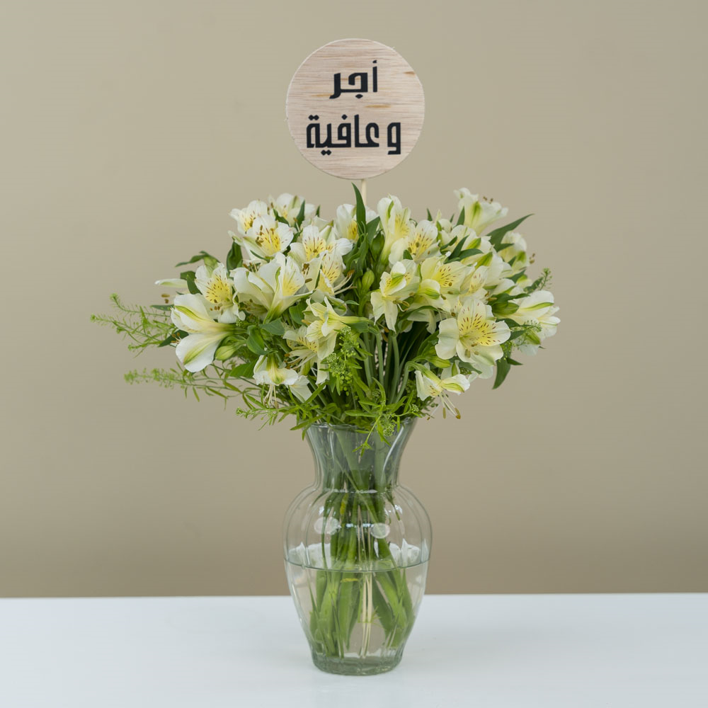 This bouquet contains white alstroemerias, arranged beautifully in a vase.
