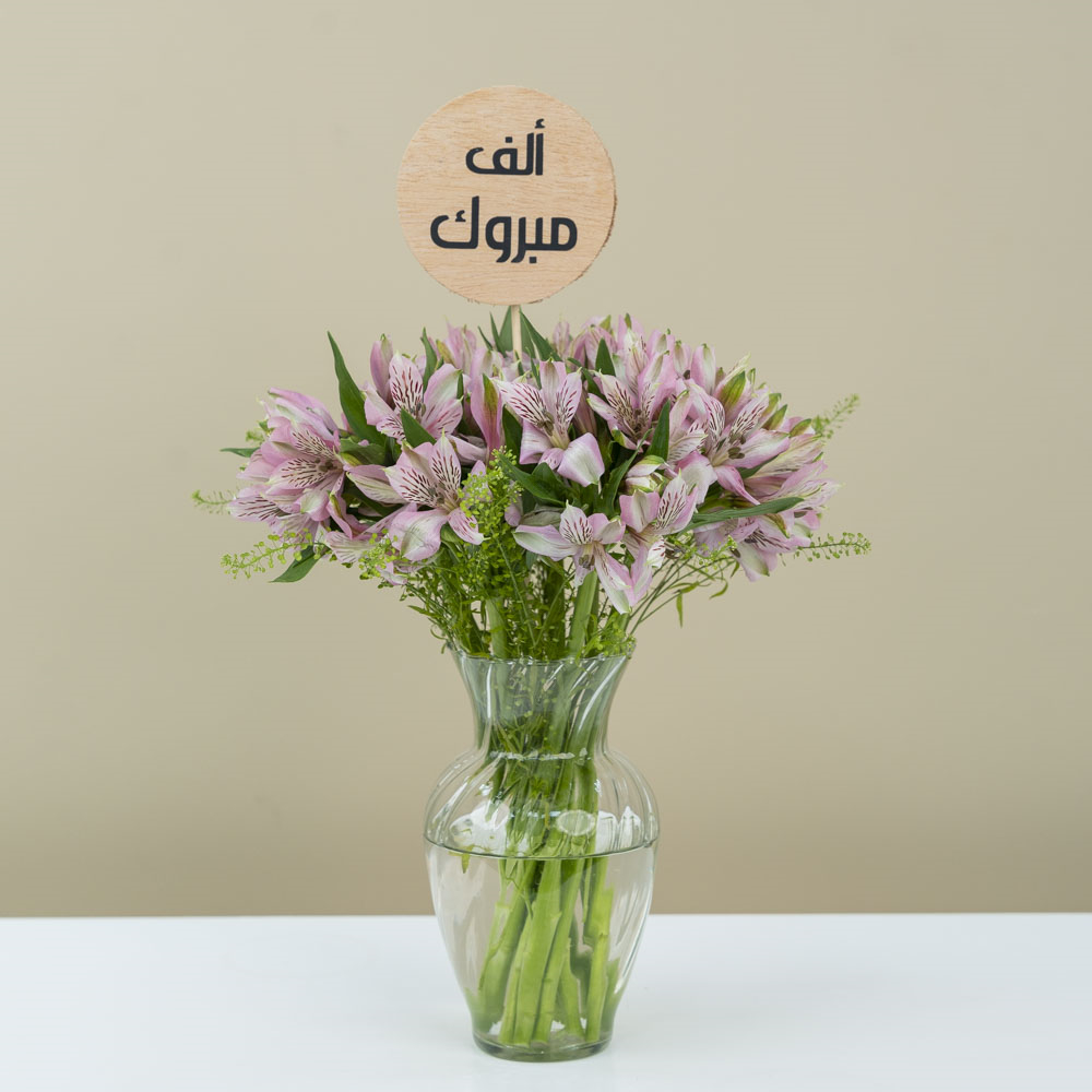 This bouquet contains pink alstroemerias, arranged beautifully in a vase.