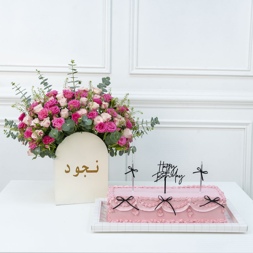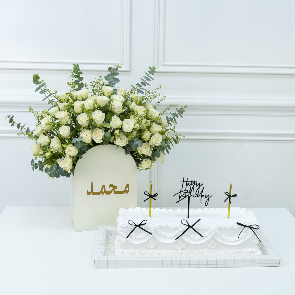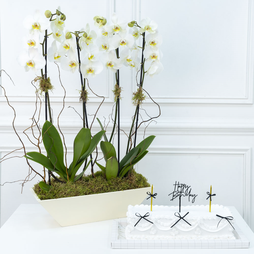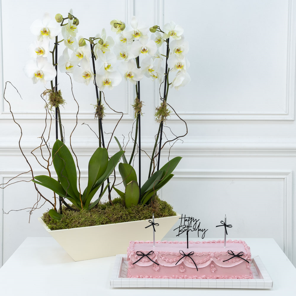 A bouquet that contains orchids along with a chocolate cake.