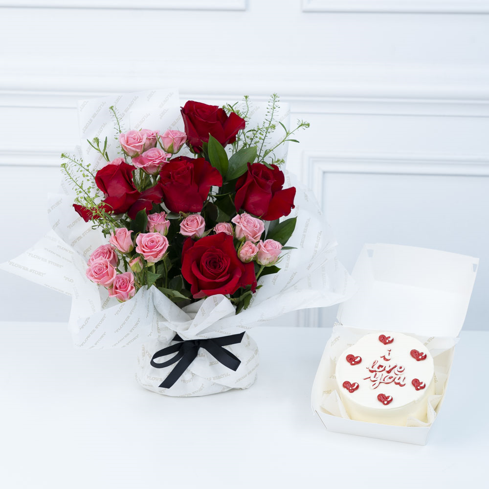 This bouquet contains roses and baby roses with a mini chocolate cake.