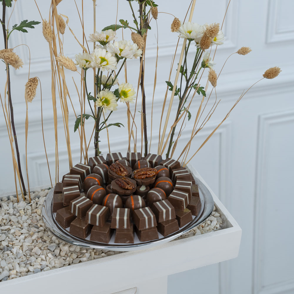 A beautifully designed wooden stand decorated with natural and artificial flowers, comes with luxury chocolates.