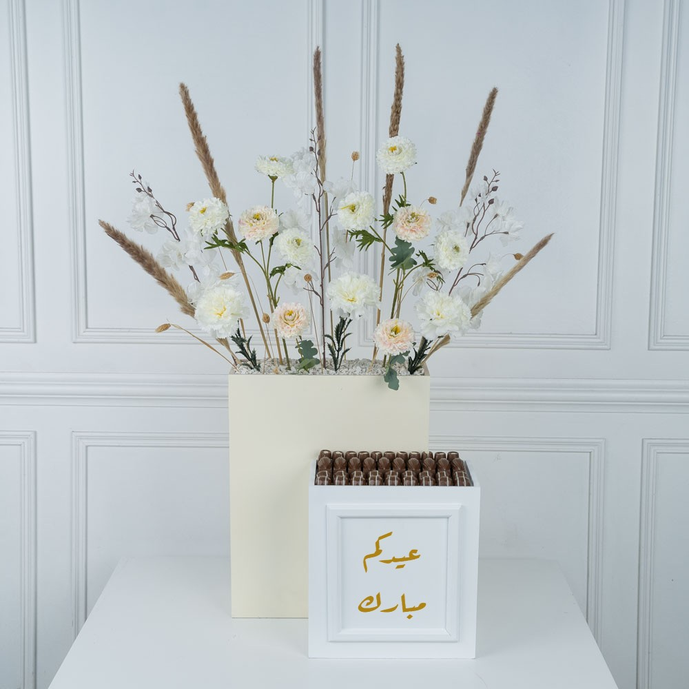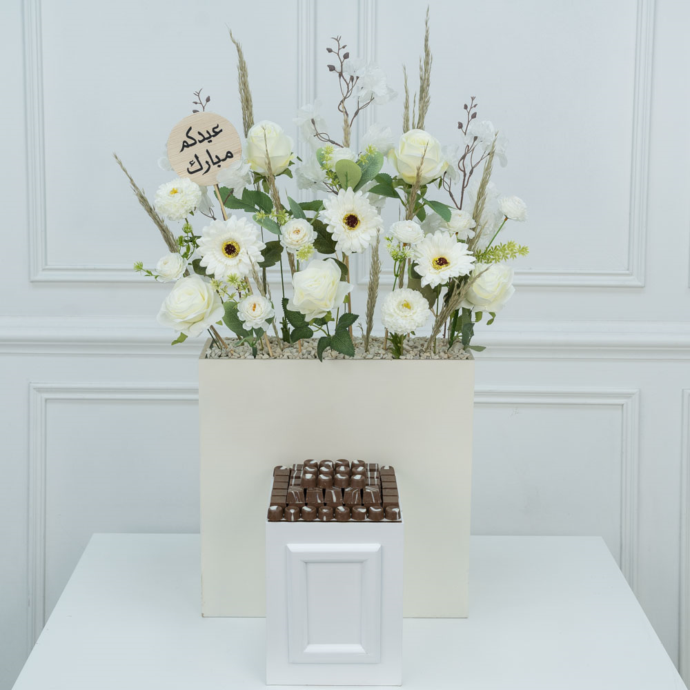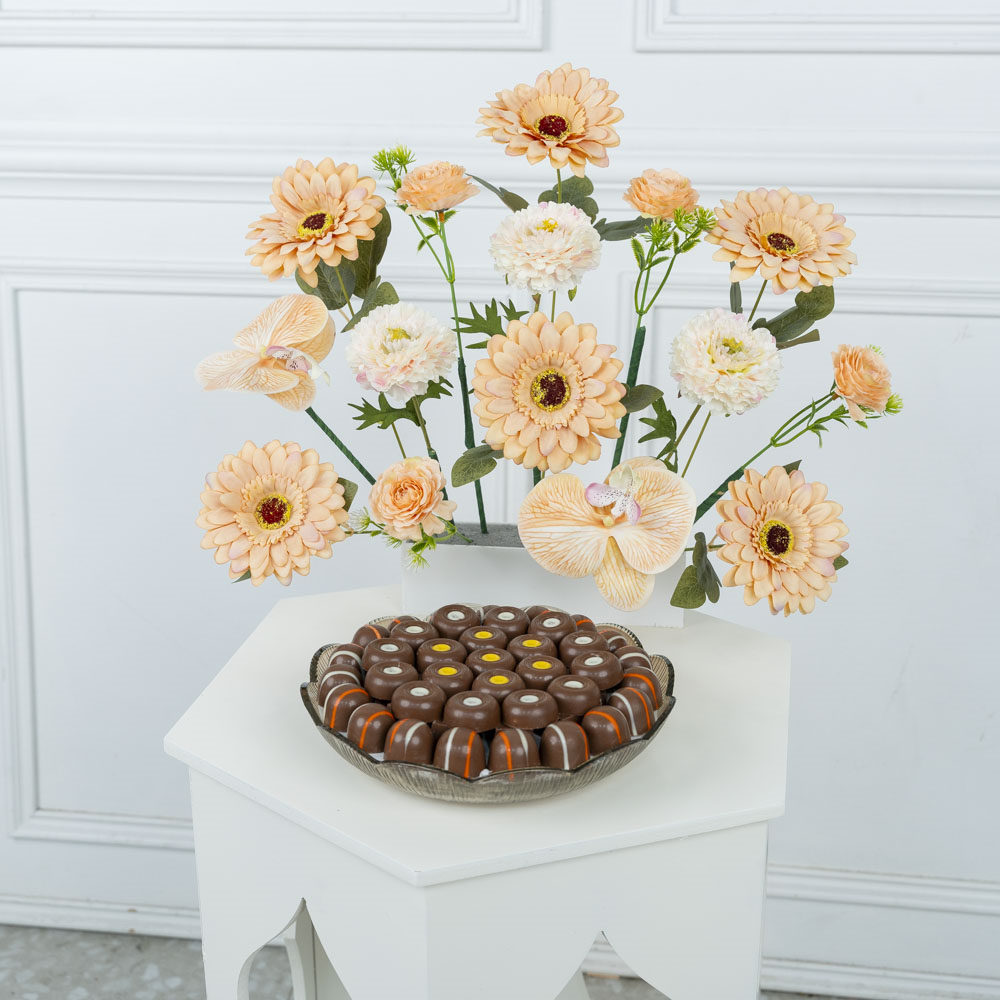 A beautifully designed wooden stand containing artificial flowers, along with a plate of delicious luxury chocolates.
