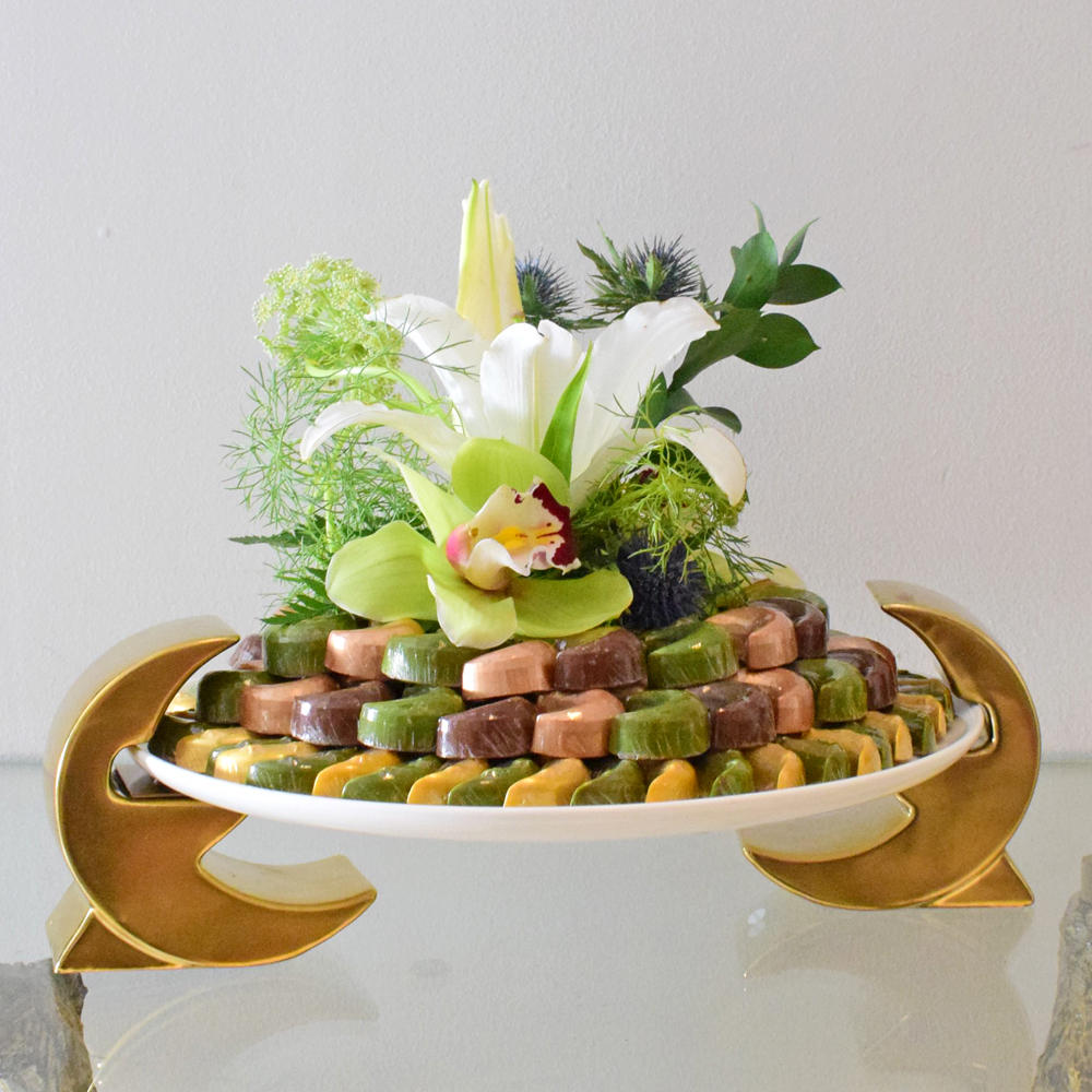 A moon-shaped stand on a ceramic plate with Eid Mubarak chocolates and a decoration of fresh casablanca, cymbidium, hemomodius, and eryngium flowers.