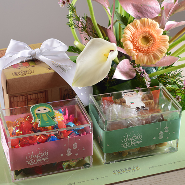 Gergean tray with 2 acrylic box and carton box of candies, chocolates, kuwaiti sweets and ramadan sweets with a decoration of gerbera, calla and wax flowers.