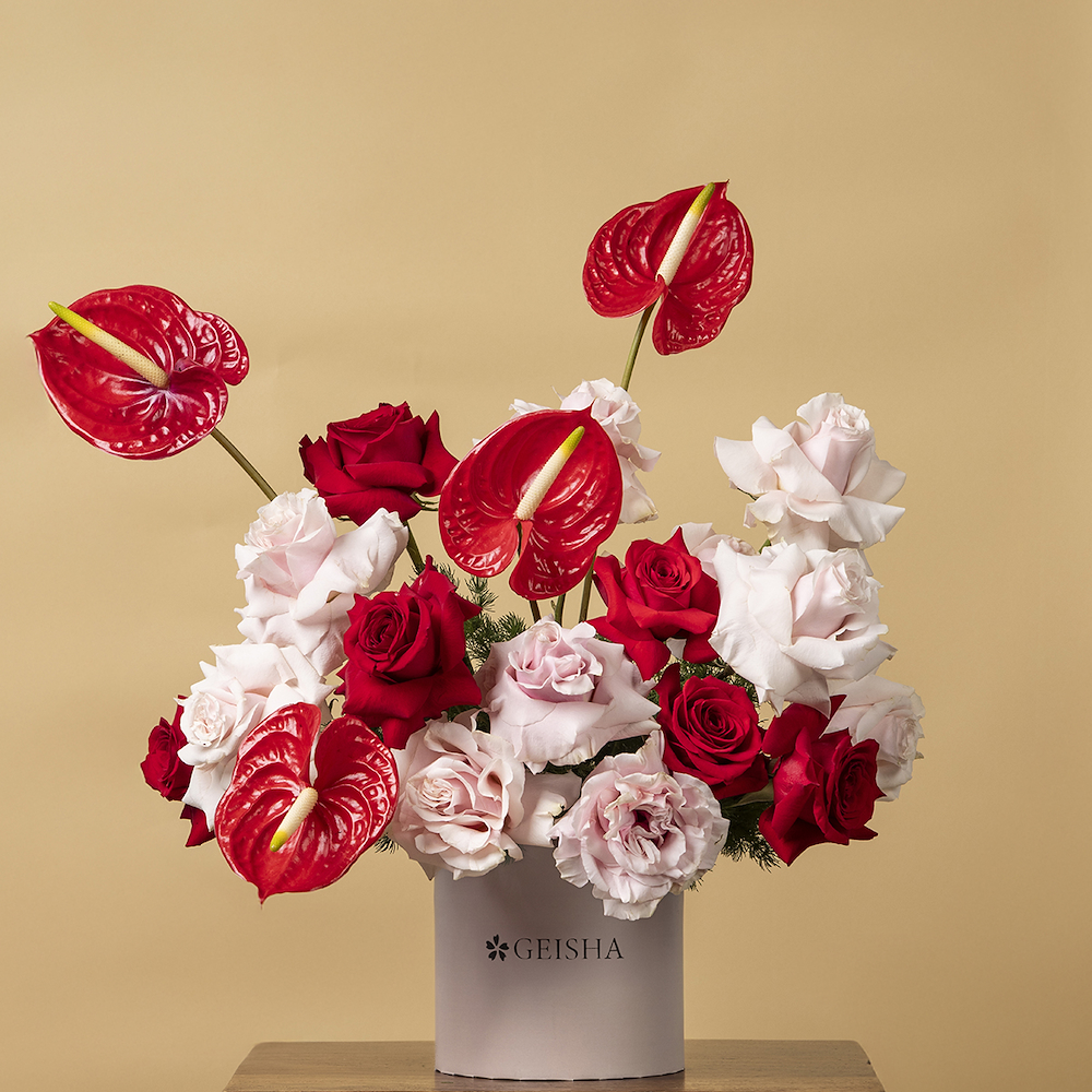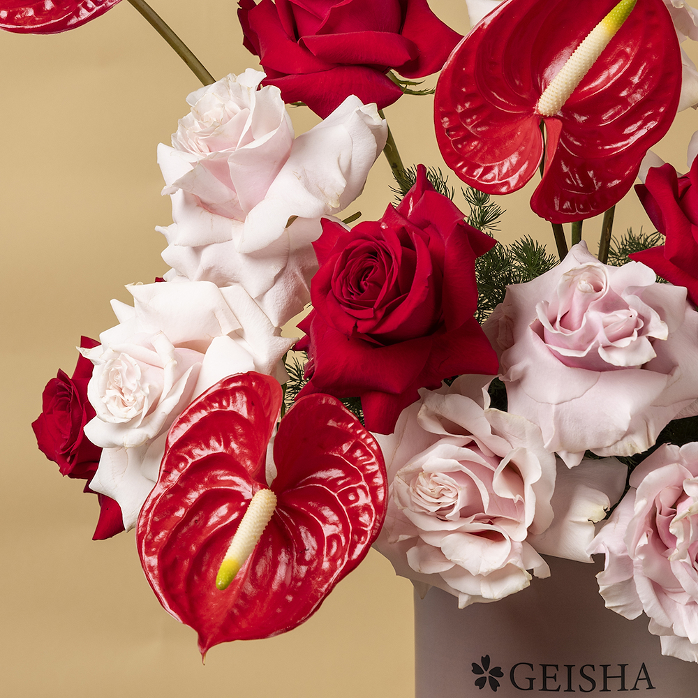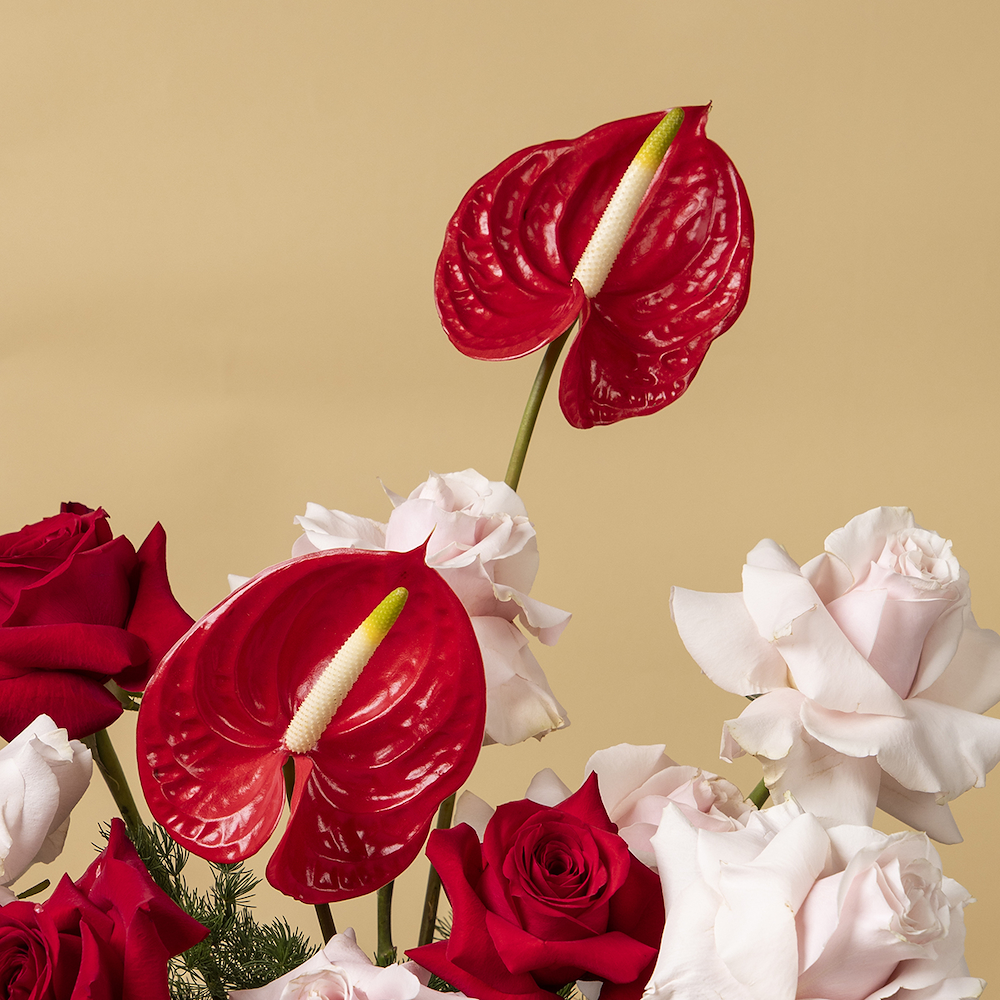 A box that contains roses and anthuriums.