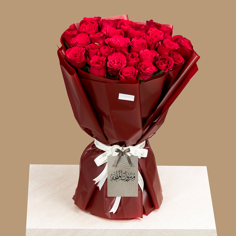 A hand bouquet of red roses, uniquely coordinated with the engagement label.