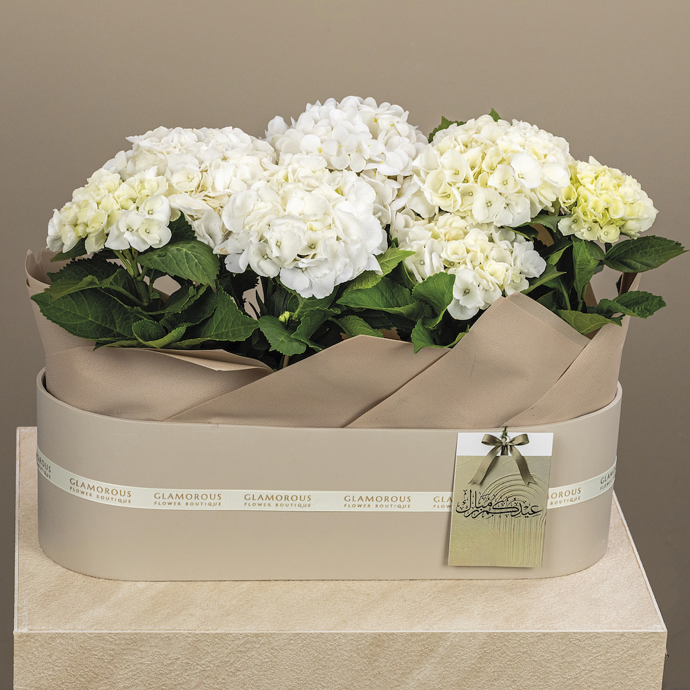 An elegant vase containing Dutch hydrangea flowers with a touch of greens, beautifully arranged.