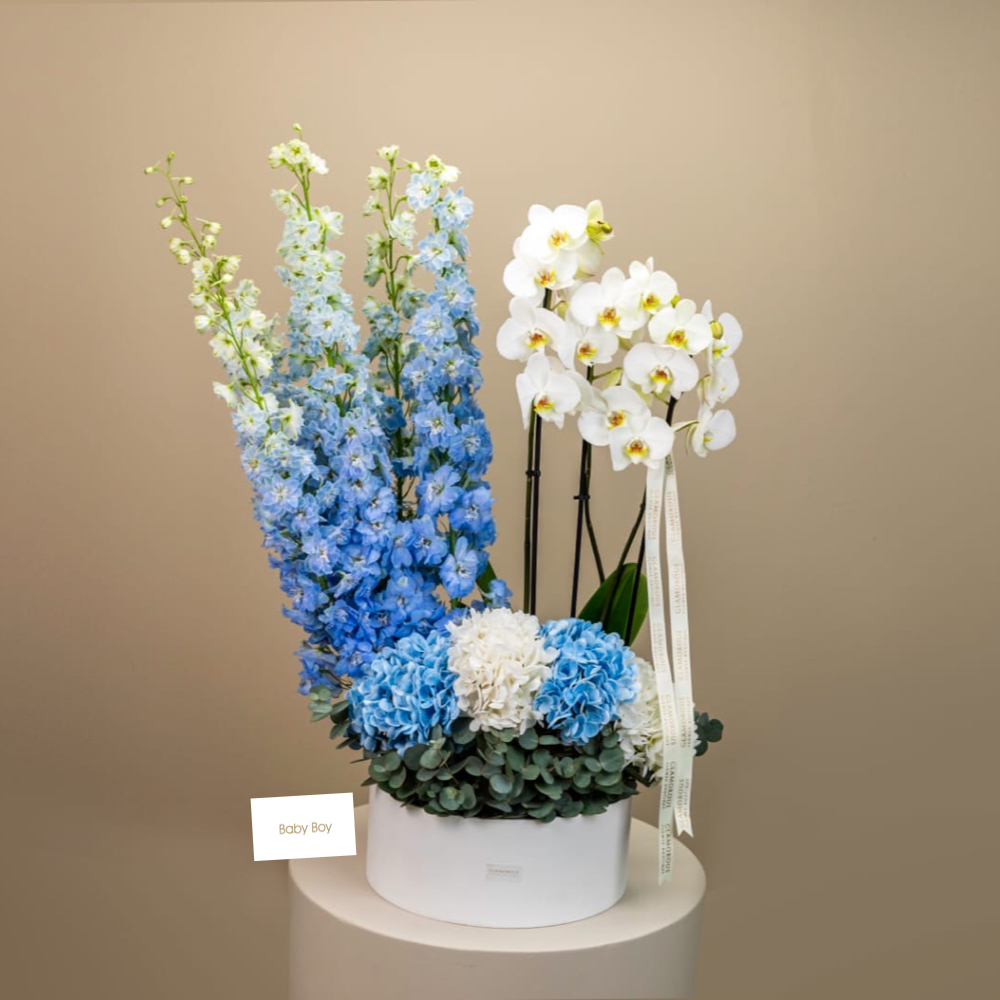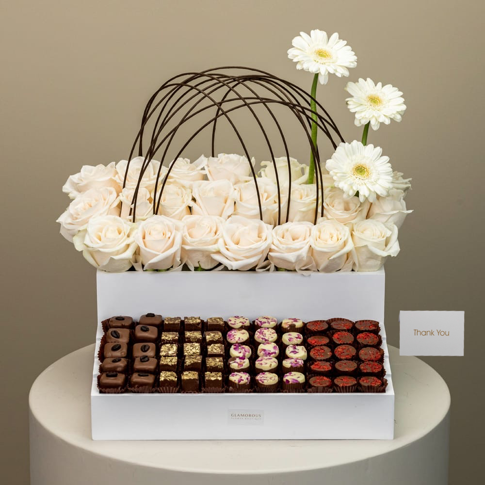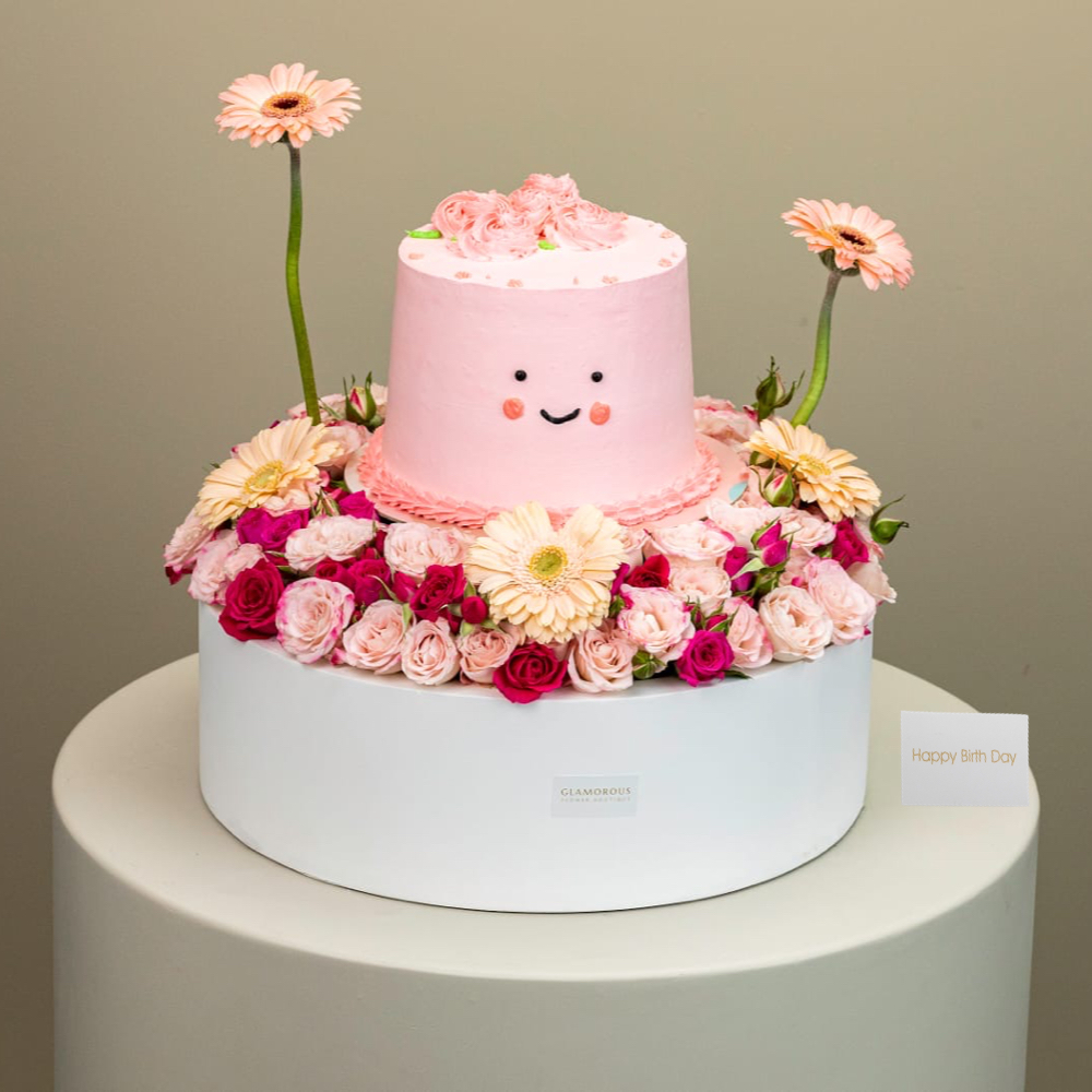 A base with baby roses in fuchsia and pink, and pink gerberas. with a delicious cake that serves 10 people.