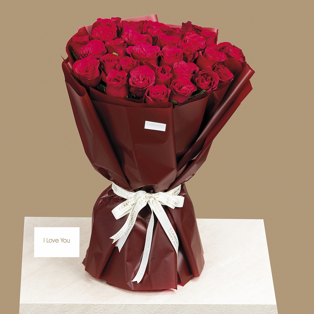 A hand bouquet containing red roses, arranged and packaged in a distinctive way.